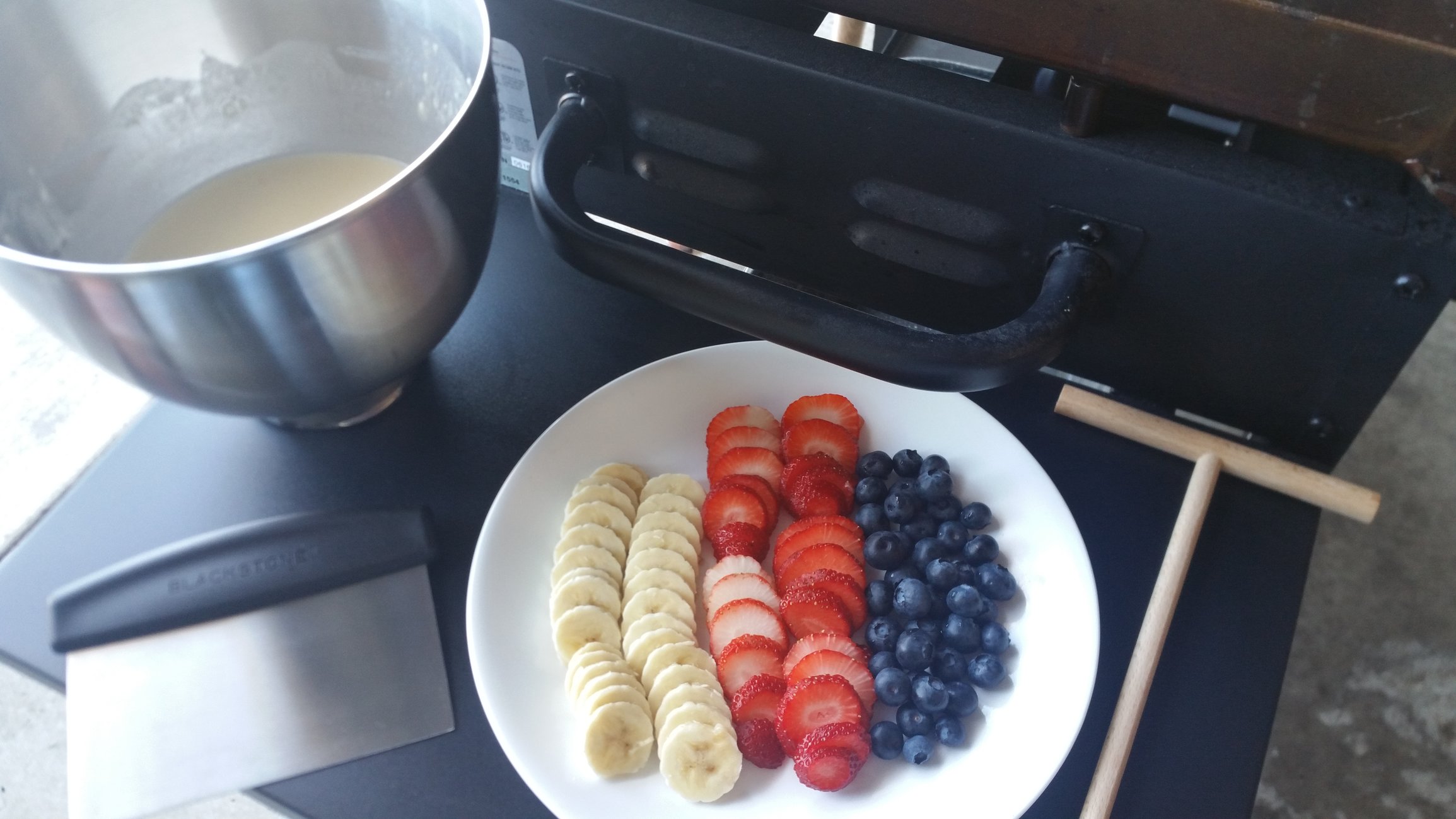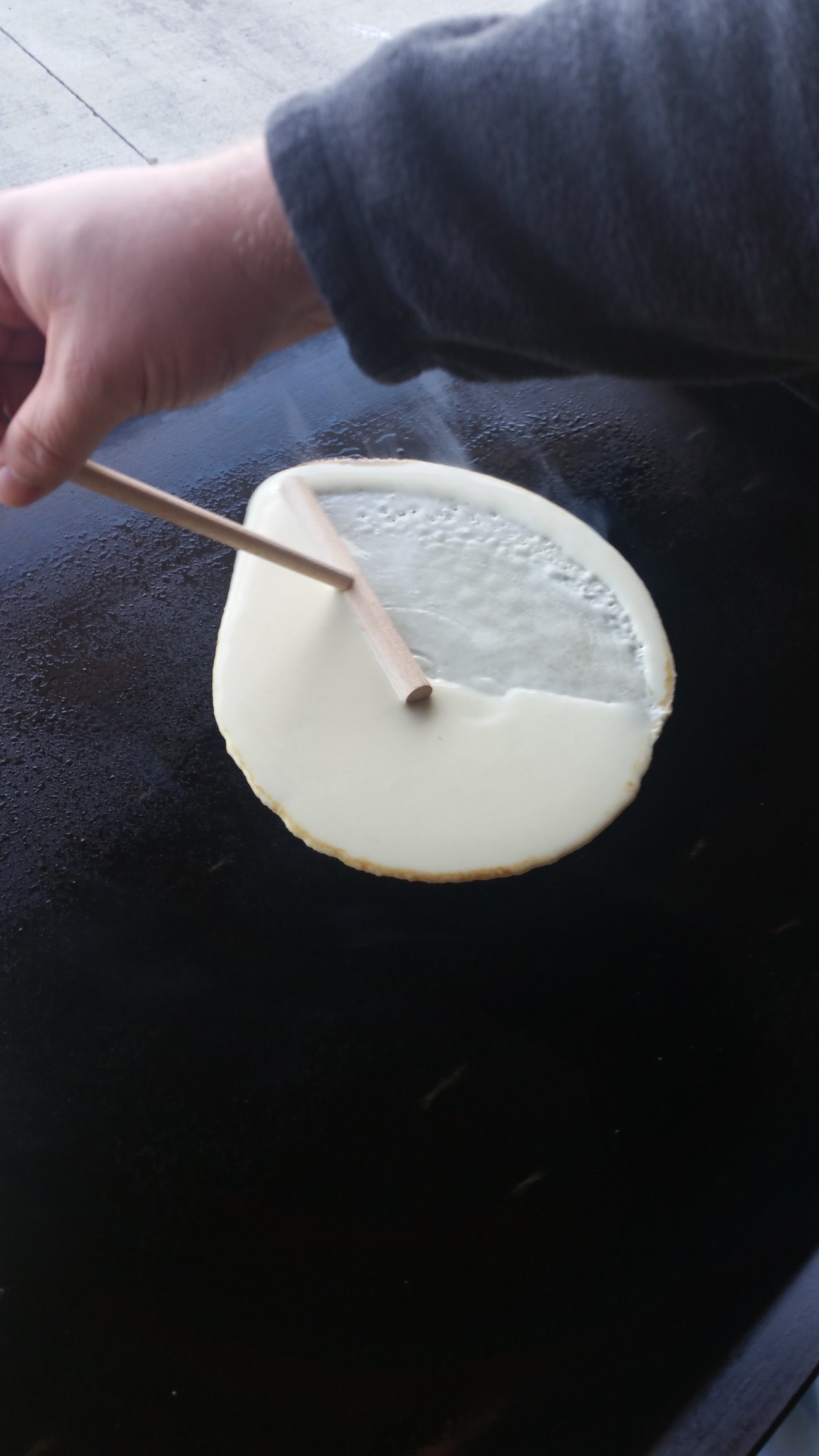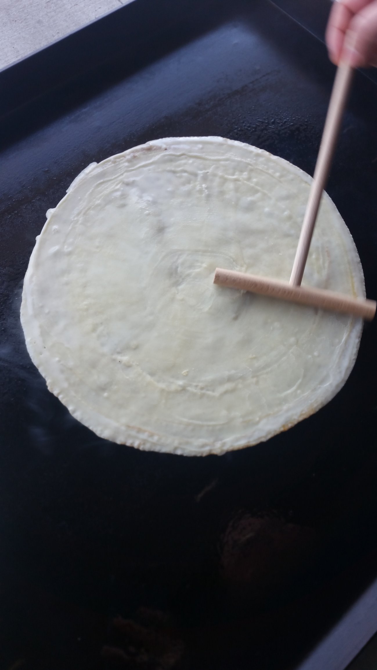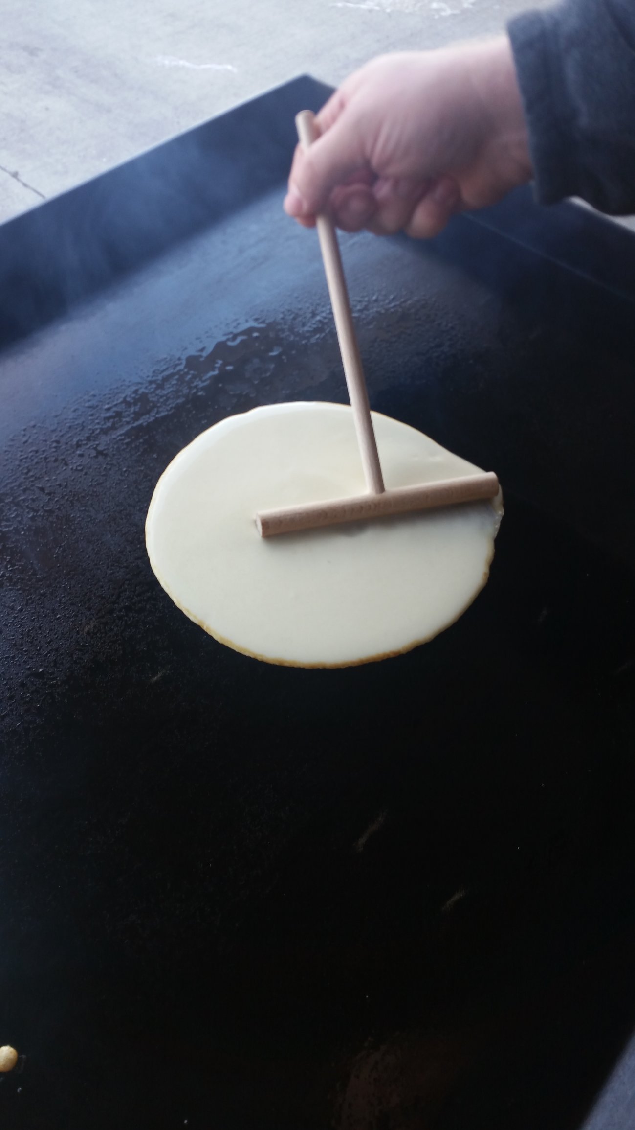 This was my first time making crepes. My wife and I really enjoyed watching the process of making them when over in Europe. With the addition of a Blackstone in the stable I went ahead and ordered a set of crepe spreader tools. The crepe tools came in last week so I figured I'd better find out how to make a crepe. They seem to be very similar to what my wife calls a "sweedish pancake".