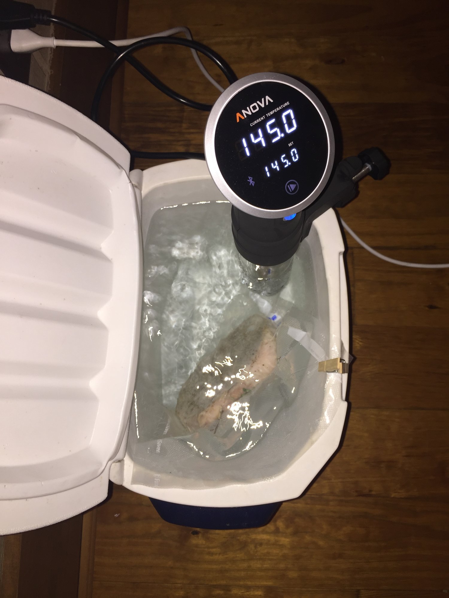Cooked a butterflied 3.5 inch poke chop with SV at 145 for an hour and 15. My much better half likes her Pork medium. In the pouch with S & P, garlic powder, fresh thyme and rosemary.