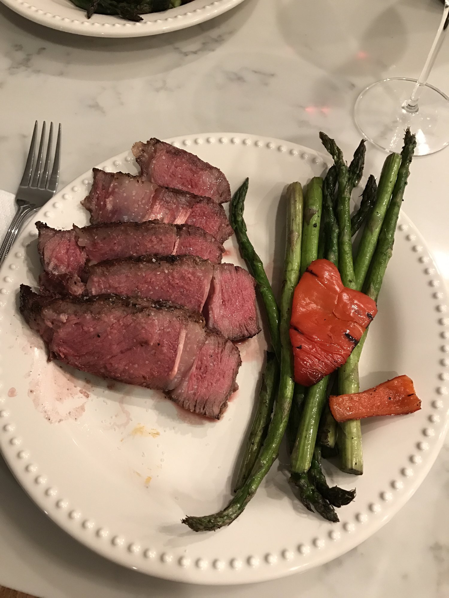Wife liked the heart lol. Reverse seared at 250 until 120. Then got egg hot to sear and do the asparagus and pepper.