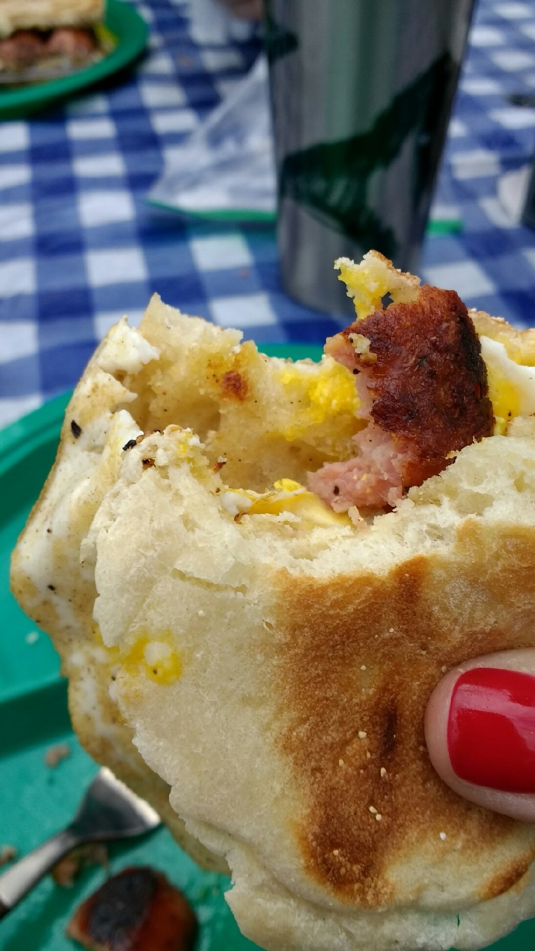 Breakfast this morning was English muffins, kielbasa, and spiced fried eggs with Ancho, chili powder, smoked paprika, garlic with s&p.