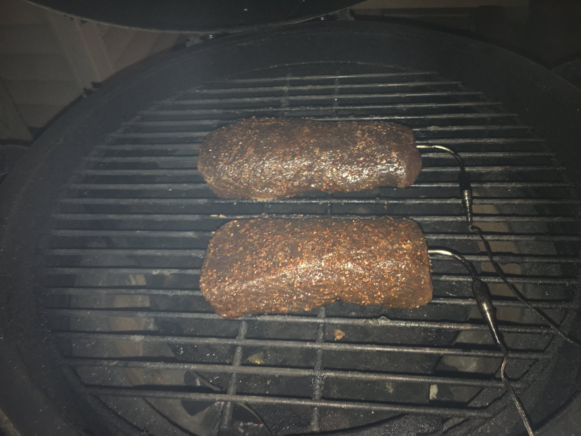 Salted for 2 hours, then olive oil and a little Dizzy Pig Cow Lick. Cooking to IT of 120 then I'll kick up to about 600 and I think I may toss a cast iron in and do them on it since it has such a low fat content.