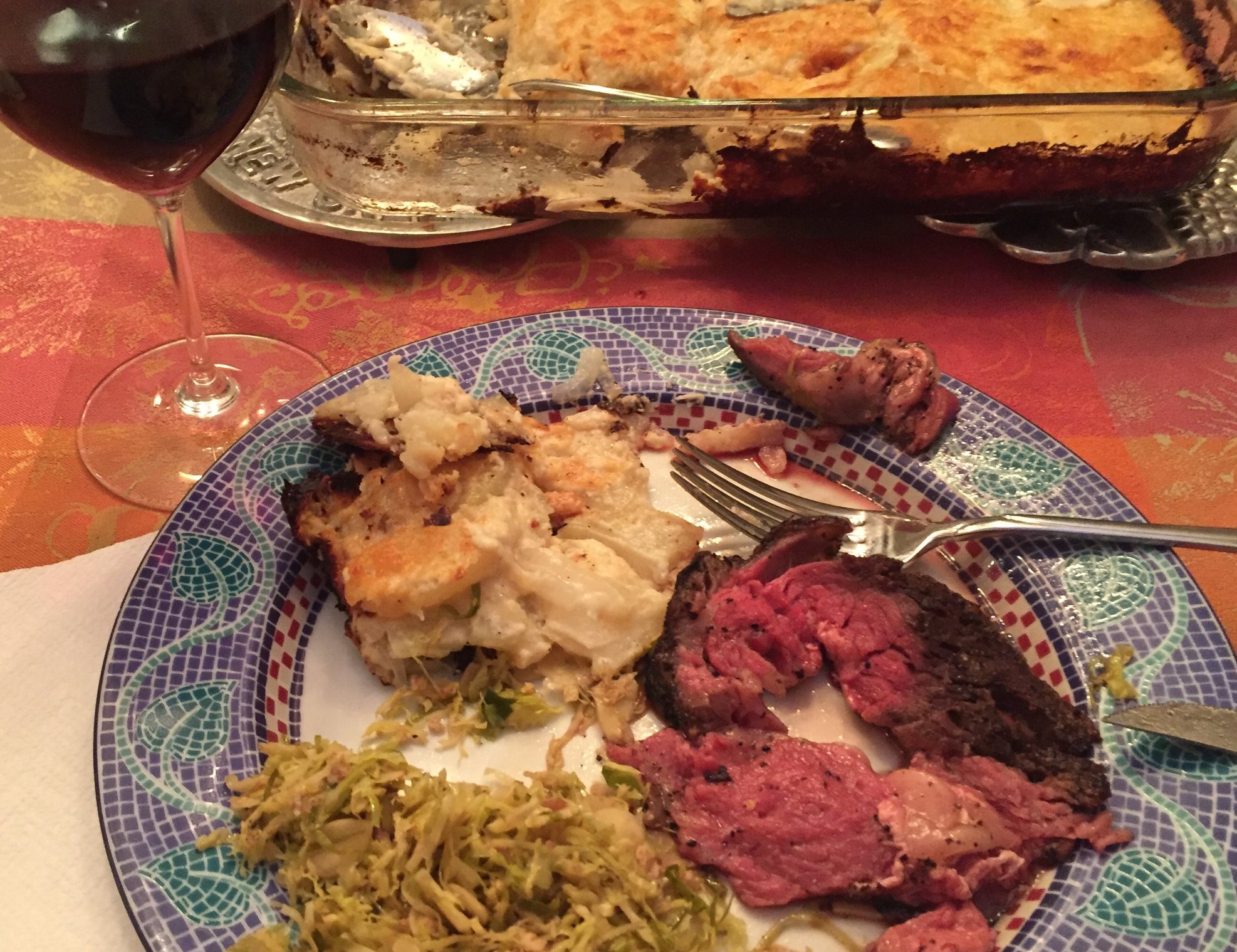 + potatoes au gratin, shaved Brussels sprouts, and a very nice Willamett Valley Pinot Noir (Le Cadeau 2009) for a special family dinner with the in-laws and nephew while SWMBO is away.