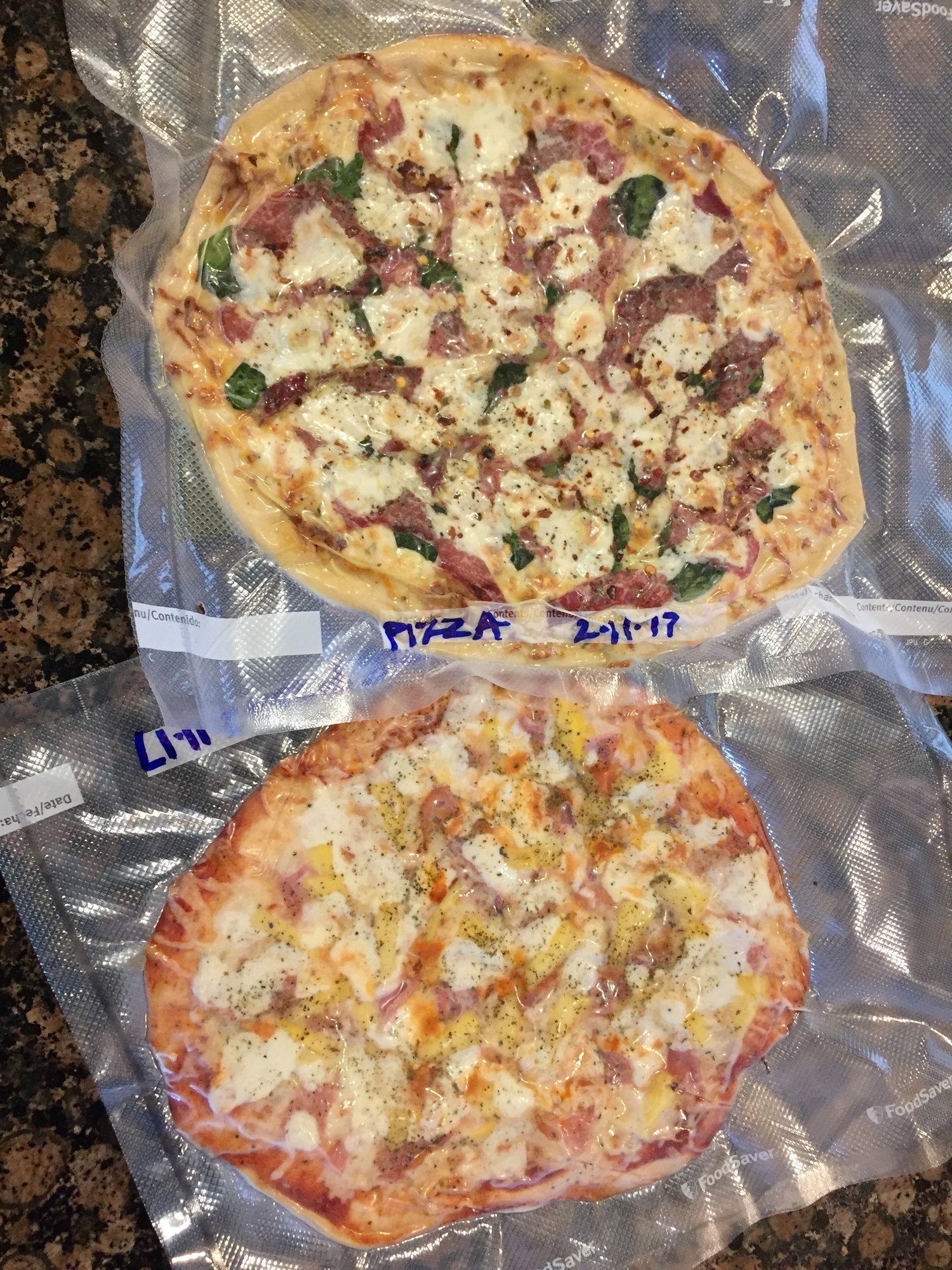 We tried a few different dough recipes and got way ahead of our appetites for pizza yesterday, so we decided to try freezing a couple of whole pies. We didn't underbake these, but probably should have. We let them cool, then vacuum sealed and into the freezer. These were thin crust, so not much to crush, but initiating the seal before full vacuum helps preserve the pie's thickness. Planning on a simple toaster oven reheat on a prewarmed stone.
