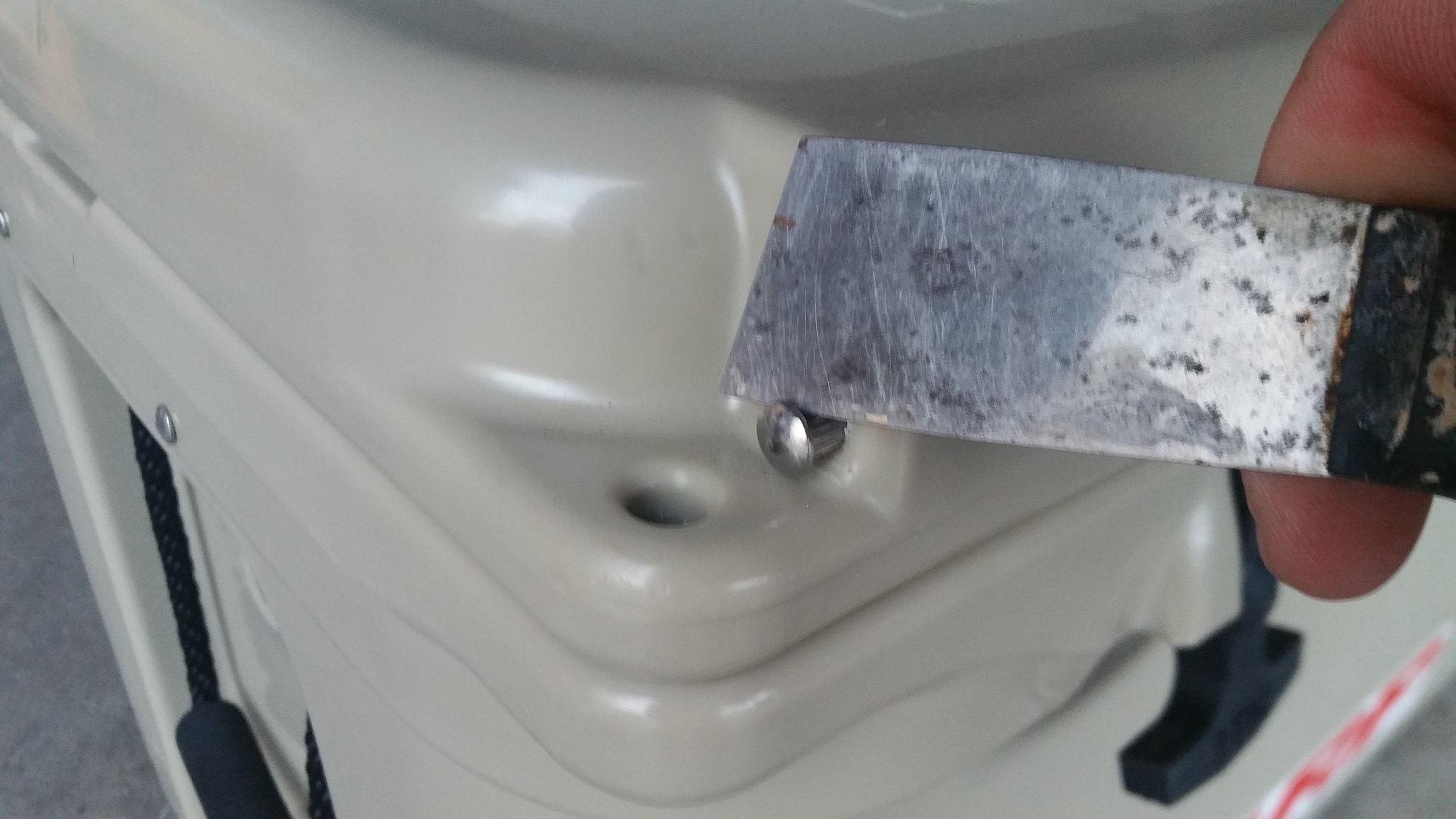 Here is the pin removed. You're going to add some stainless washers to the pin with the latch to help it from moving around. The washers may very with different sized RTIC coolers. In the video below the guy ended up using two washers for his RTIC 20. I found 3 worked better with my 65.