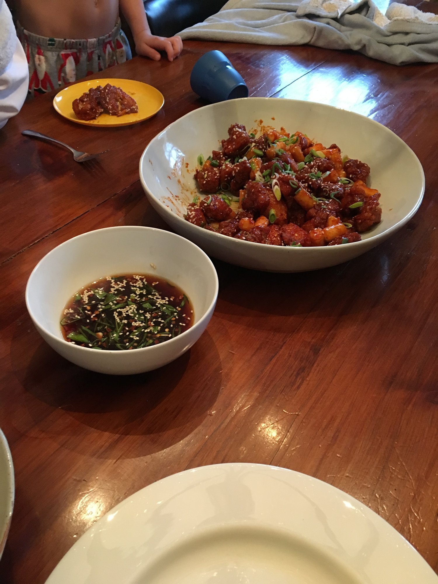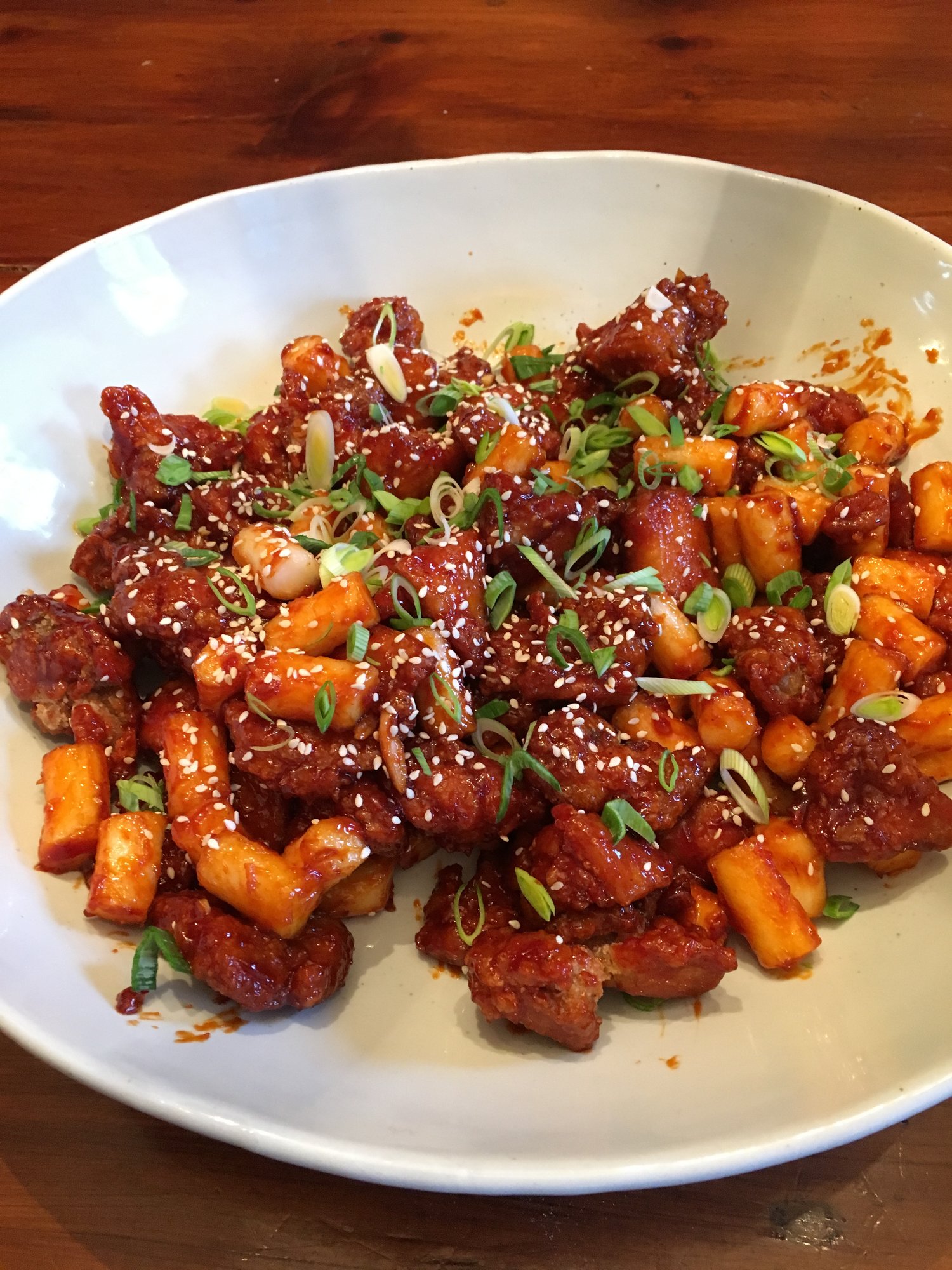 Chicken and rice cakes: https://mykoreankitchen.com/korean-style-popcorn-chicken/