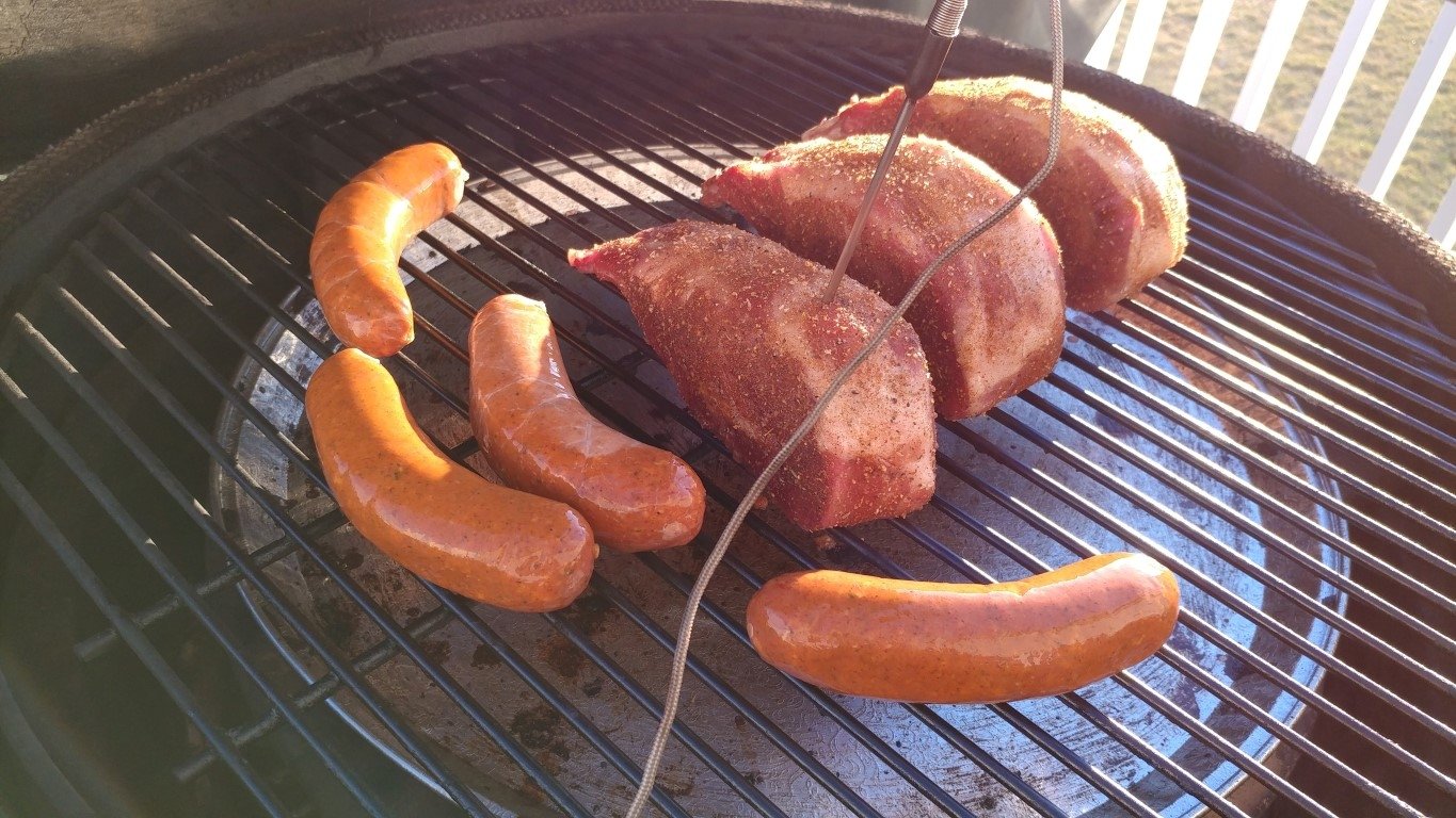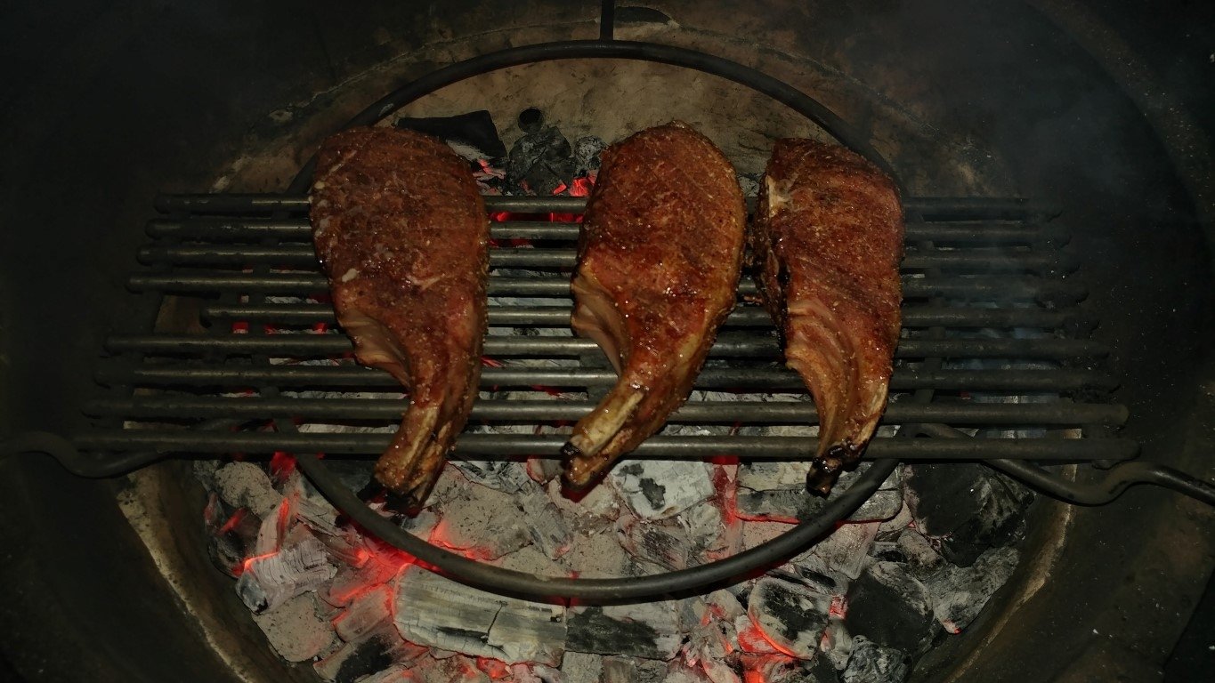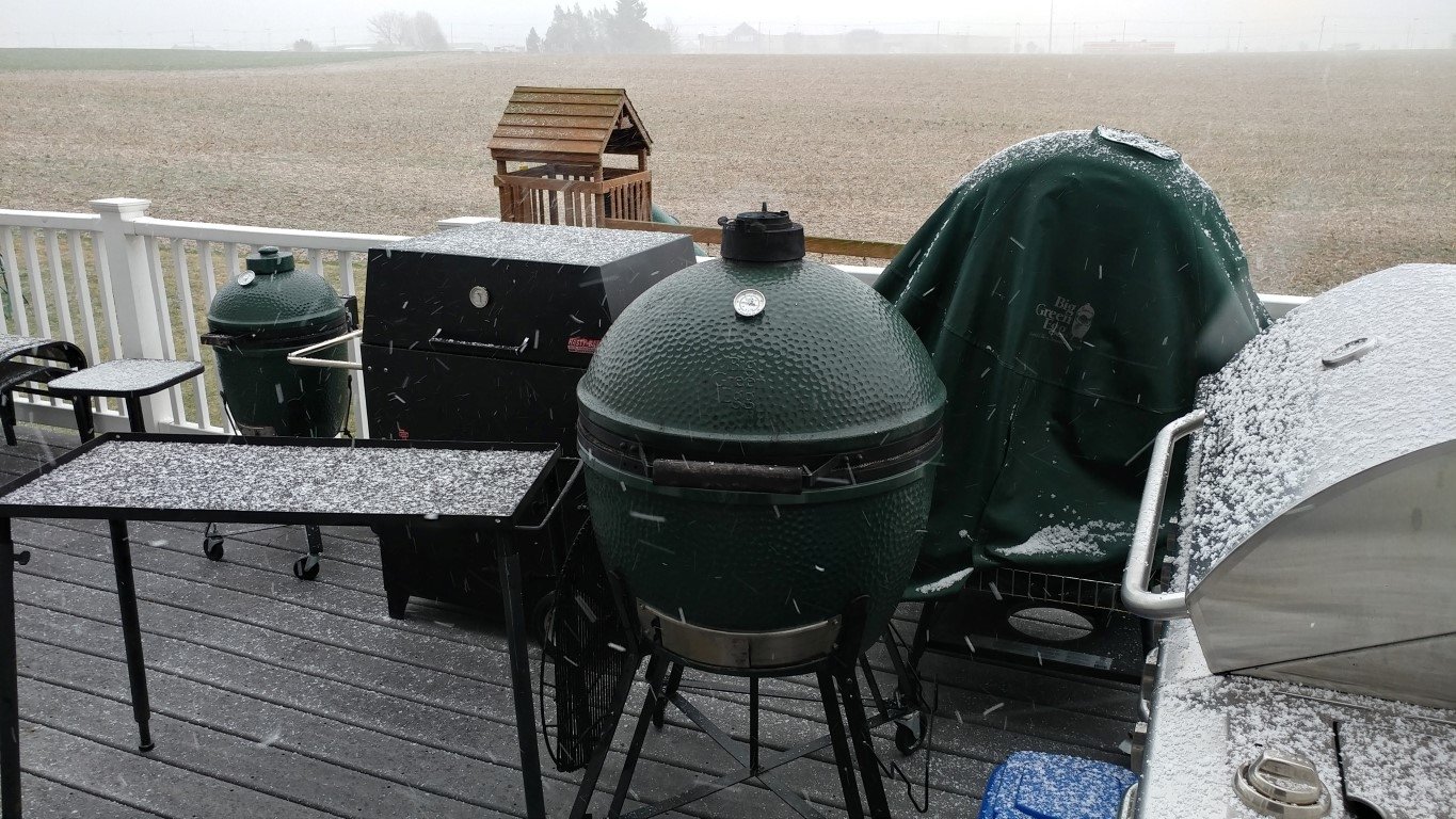 Got the XL started with some apple wood for smoke just as a snow squall rolled through.