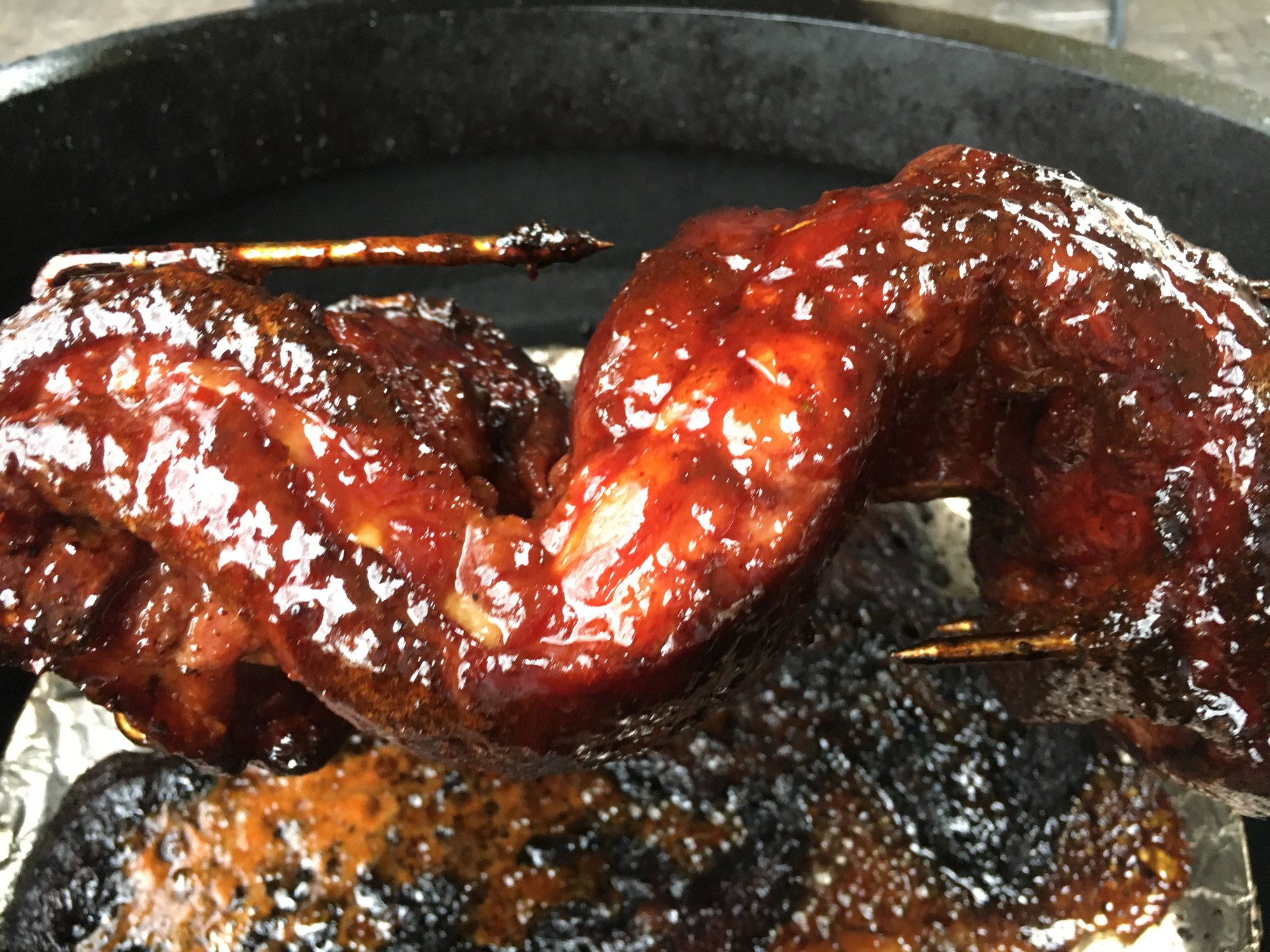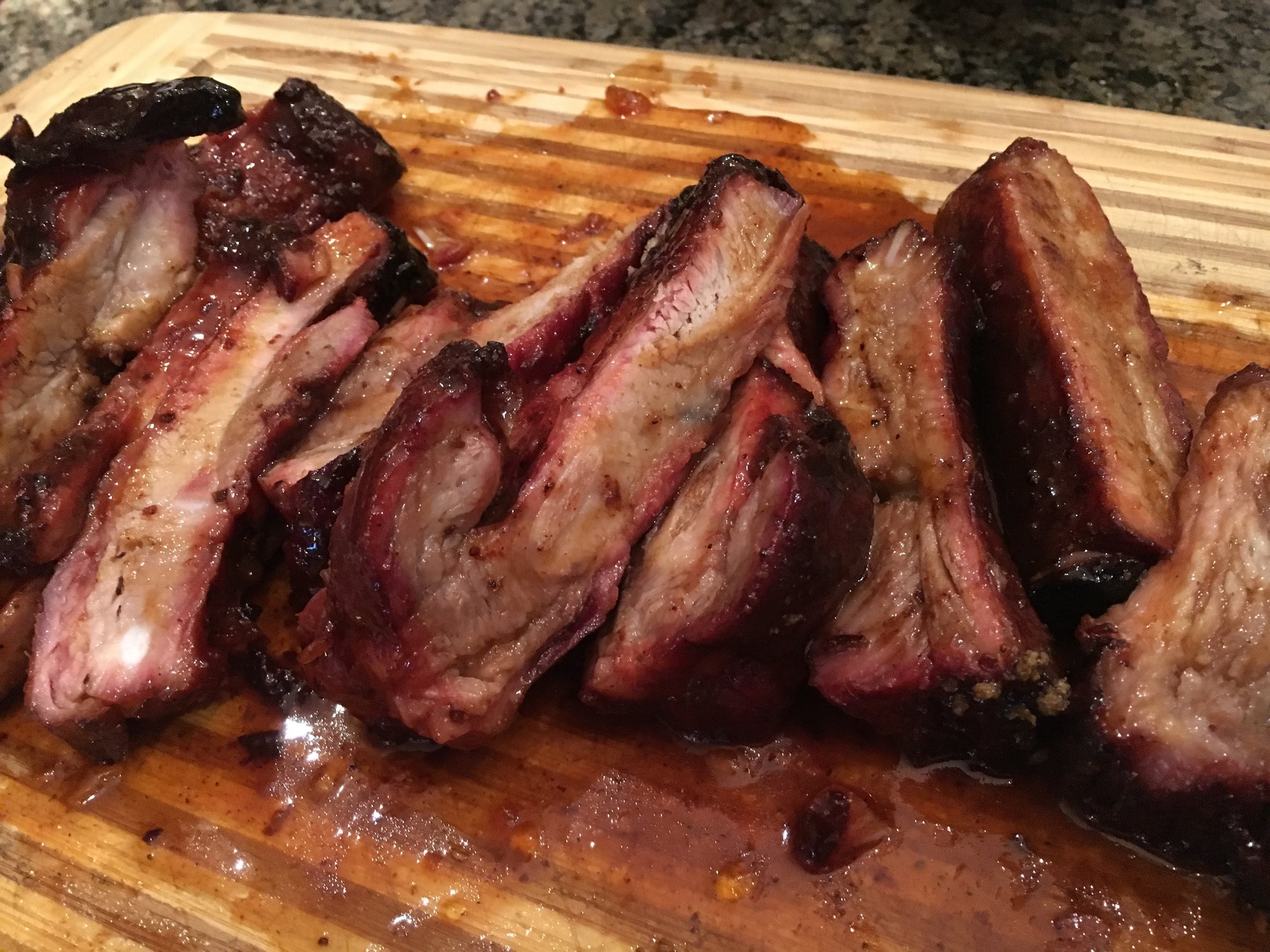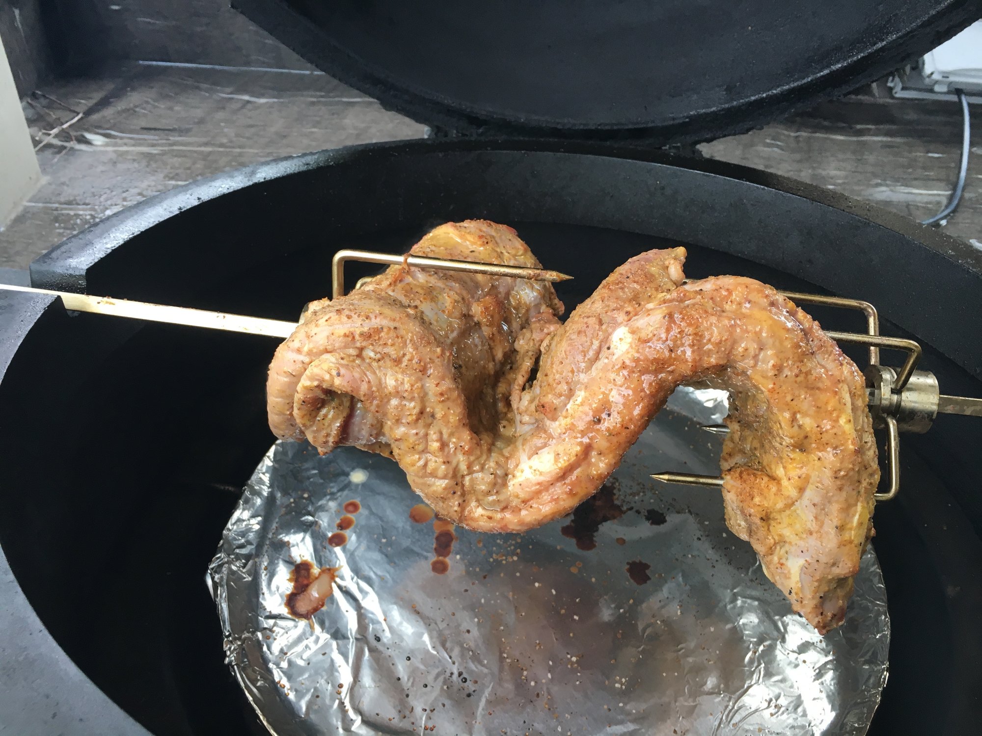 I know it is not @tjv s favorite eggcessory, but I used his spider, stone and drip pan for this 6 hour 250 cook. The spider allowed me to have a drip pan low enough with space for the ribs. I have had troubles in the past maintaining low and slow cooking direct with the rotisserie, but not this time. Played around and added a wrapping mixture of brown sugar, honey and apricot preserves after two hours, without the wrap. Then continued the cook for 5+ and added some sauce with apricot, bbq sauce and honey at the end. Turned out mighty good!