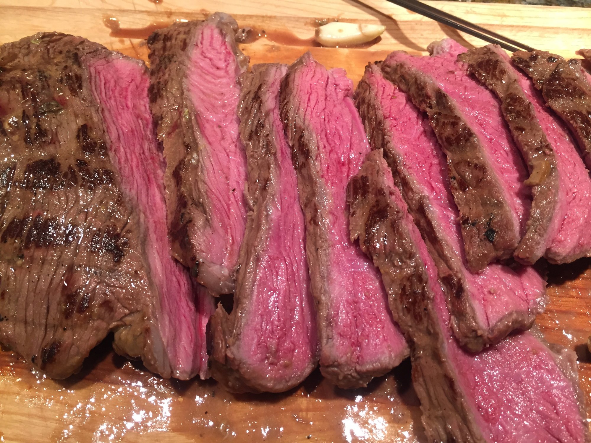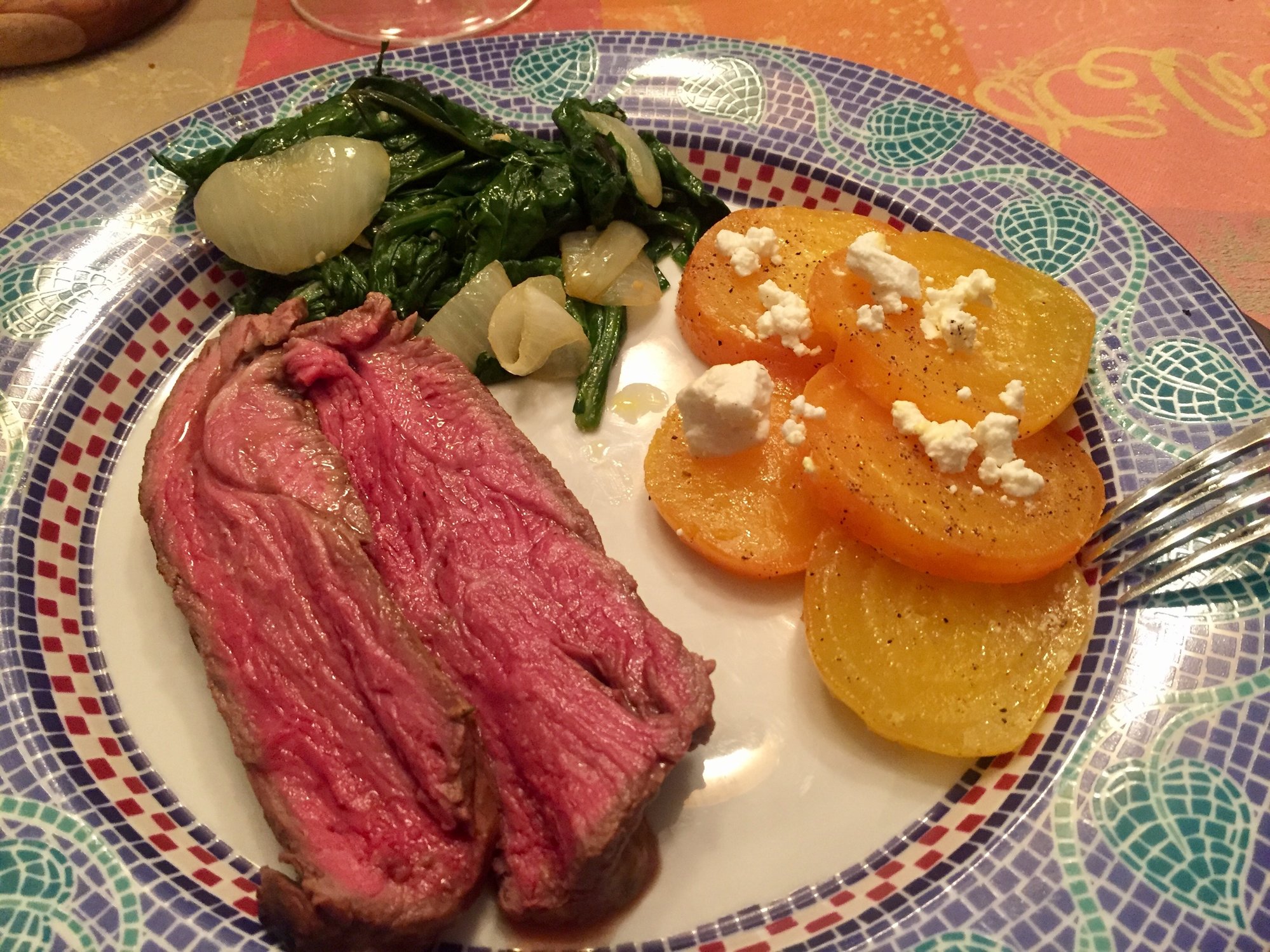Studded with garlic, bathed in a mustard vinaigrette, and reverse seared. Served with roasted golden beets and sautéed beet greens. A little Pinot Noir and a good night sleep afterwards. Nice way to end/start the week.
