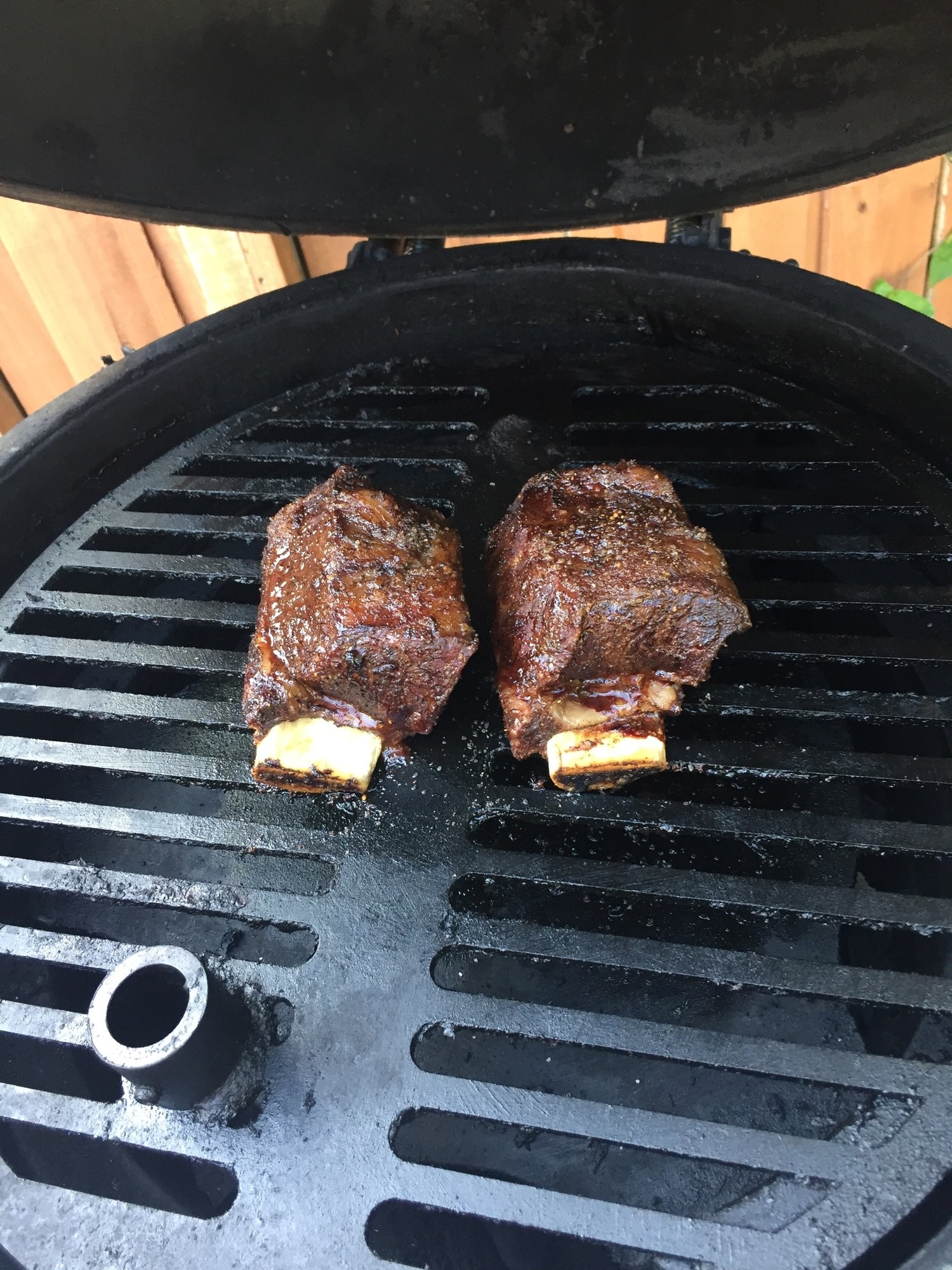Wifey and the two boys were getting back from a few days at the beach so I decided to have dinner ready. Smoked two decent size short ribs... rubbed in Mickey's, hit the eggg at 250 with some apple chunks, four hours later they were 180 IT, and then I prepared the braising liquid (beer, worstershire, sirrahca, and some rub) where it sat for another 1.5 hours at 350 until they we 205 IT. Sautéed some onions and peppers, warmed up the tortillas, and brought out the guac, salsa, and cheese. Fairly delicious!!!!
