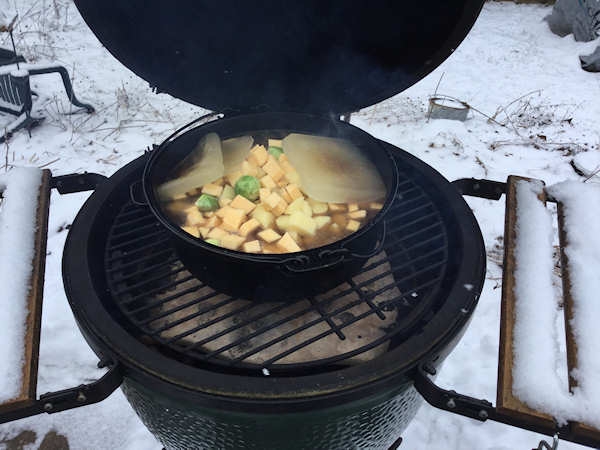 The Mini Max is done, added the pot to the large with JD Chips in it.  Those frozen cubes are home made vegetable broth (low sodium and so much better than store). Added potatoes, turnip, Brussels sprouts, and carrots.