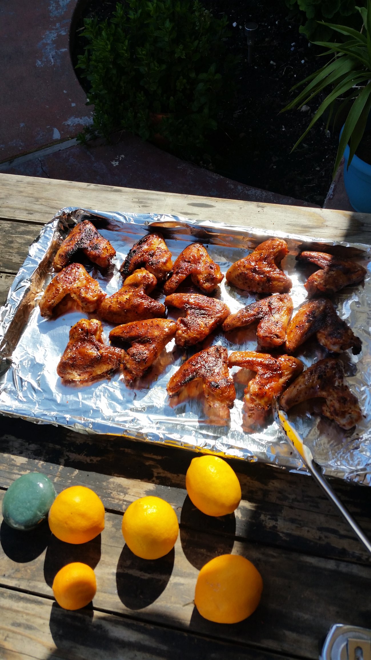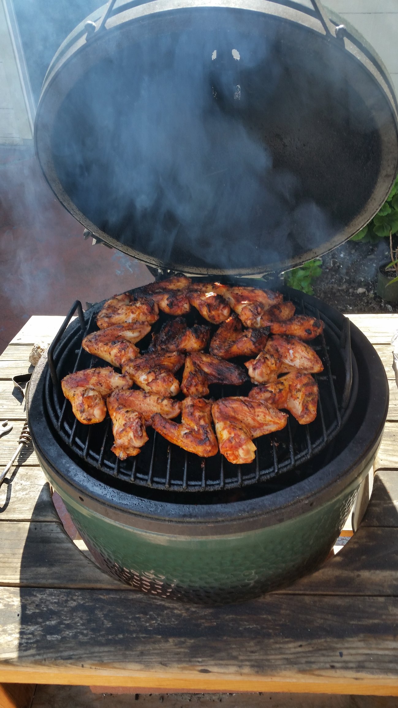 Rubbed with Bbq Bros Carolina style rub, then raised indirect on the medium egg at 400-450, for about an hour, flipped and rearranged once. These, a salad, a cocktail,good company. ...And now a nap, Bon Appétit eggheads.