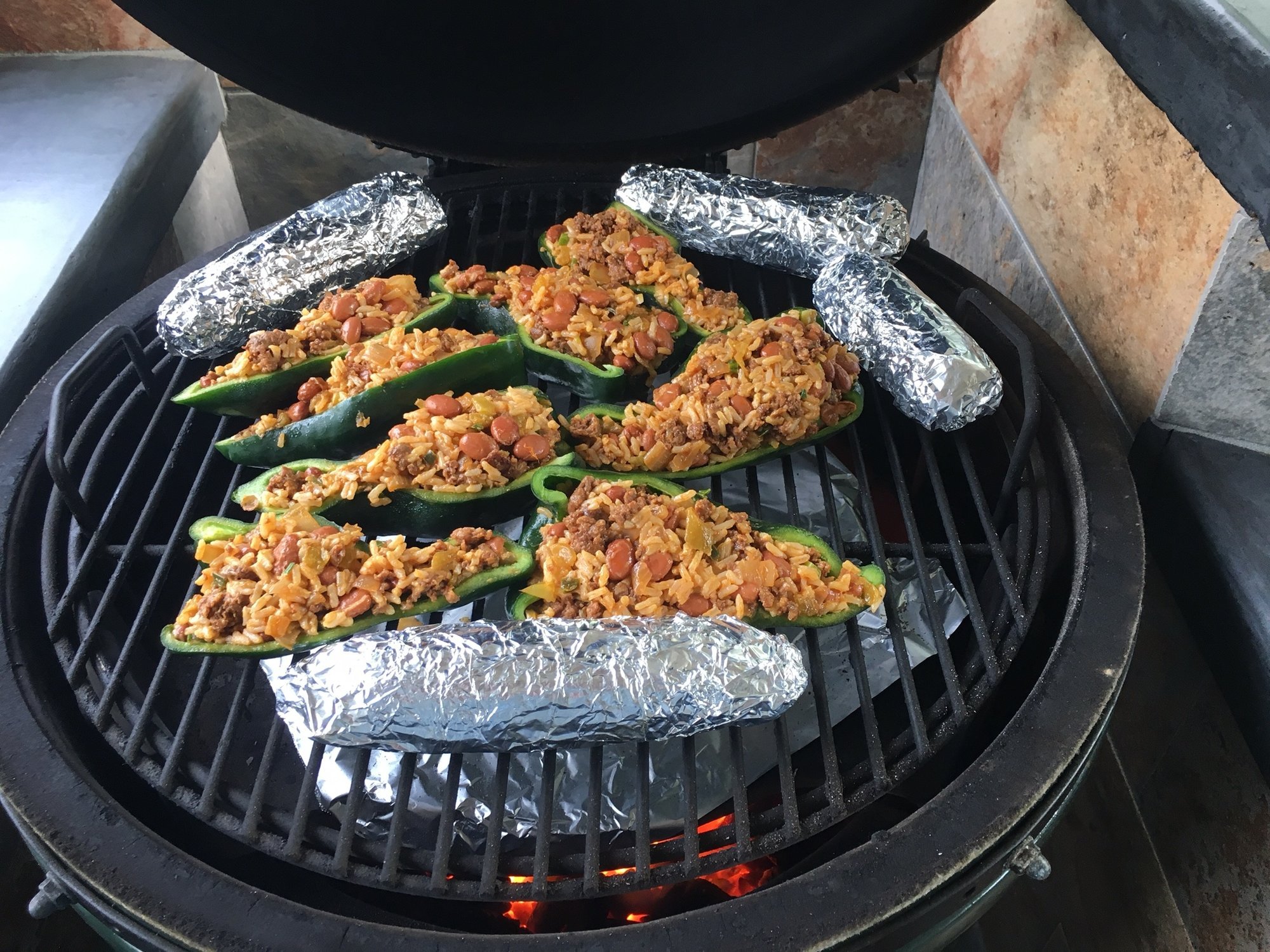 Been doing these a bit and they never disappoint. Have tried cajun style, quinoa/squash/zucchini (veg), but for tonight's version, we went Mexican. Sauteed onion, jalapeno and green chili. Added pinto beans, chorizo and a mix of cumin, chili powder, salt, pepper and then mixed with rice and cheese. No measurements, just what looked right. Cut poblano peppers and stuffed.