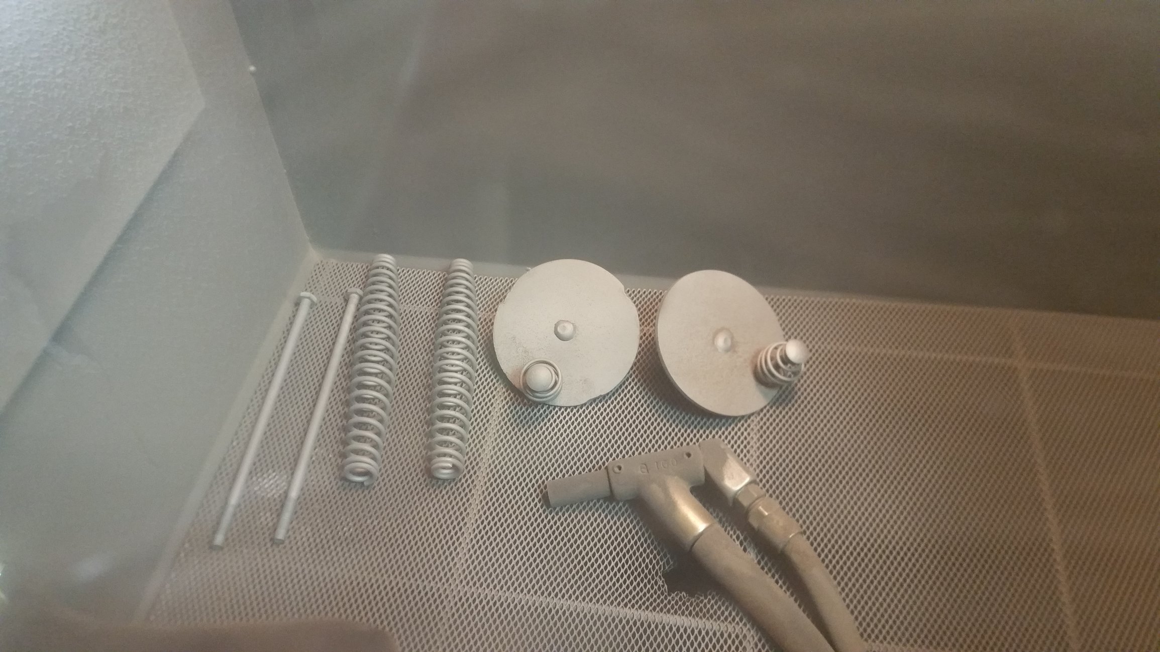I sprayed a few more coats on the lids today. I heated the lids the best I could with the weed torch. I did sneak some of the smaller parts in the oven this afternoon when the wife was gone. =) The first time I've ever used my oven!