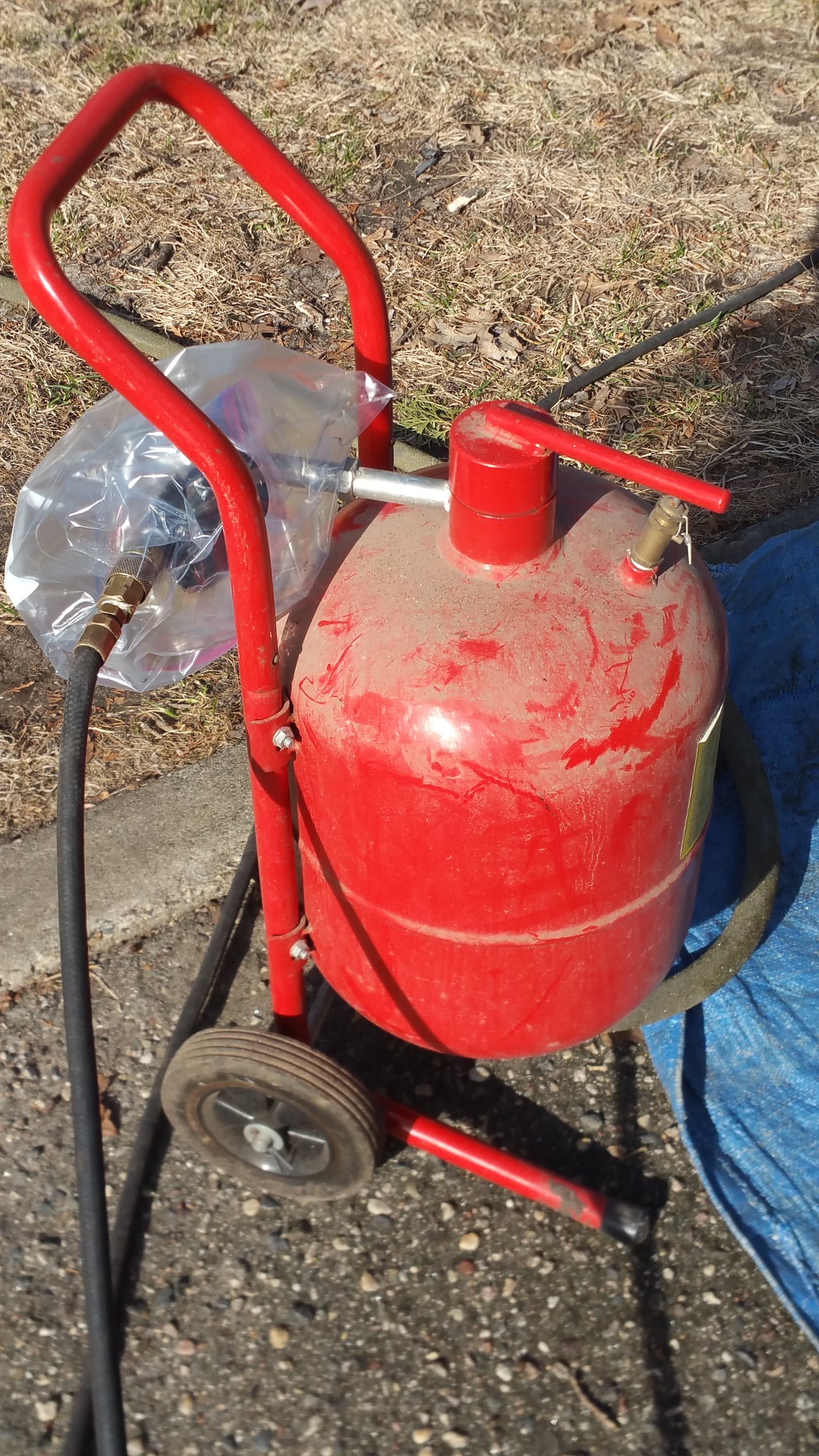 This is what I'm working with. Way too small for a job like this but I'm making it work. I'm on the second regulator on the sand blaster. =) I'm also fortunate my dad has a 100+ gallon air compressor. No way my 20 gallon air compressor would keep up. So really shouldn't complain too much.