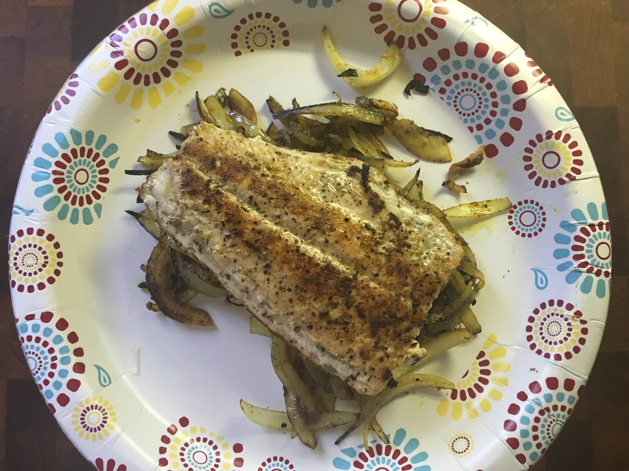 I had no leeks, but I did have salmon, curry and an onion. I julienned the onion, added some oil to the griddle and softened them up for a bit. Then some curry powder and a pinch of salt plus several grinds of pepper. Mixed well and shoved them off to the cooler side.Took one of the 4 oz salmon pieces from ALDI , some more oil and onto the griddle. Cooked that, flipping once or twice, to an IT of about 130°.