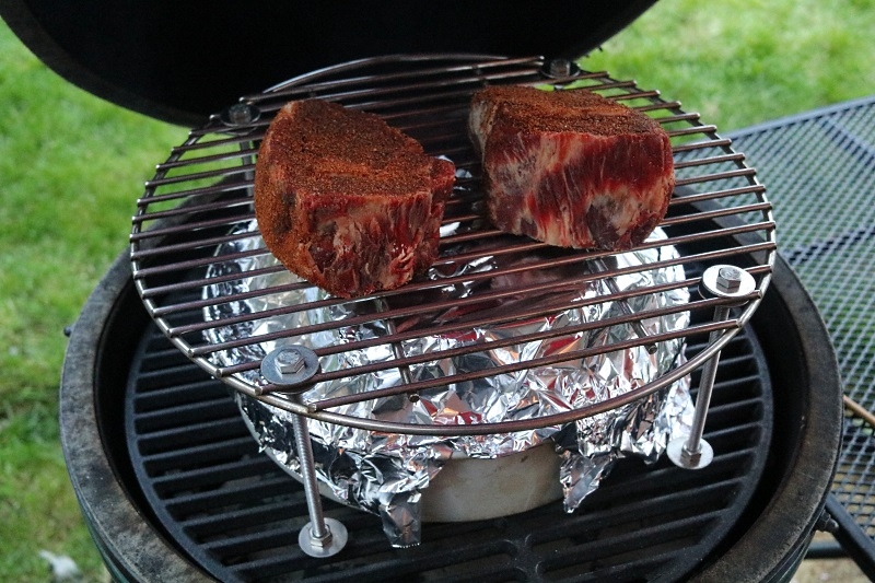 I then checked that the Weber tray could stack above the sweet potatoes. The Weber tray was held up on a mini BGE grid (10 inches) supported by some bolts: