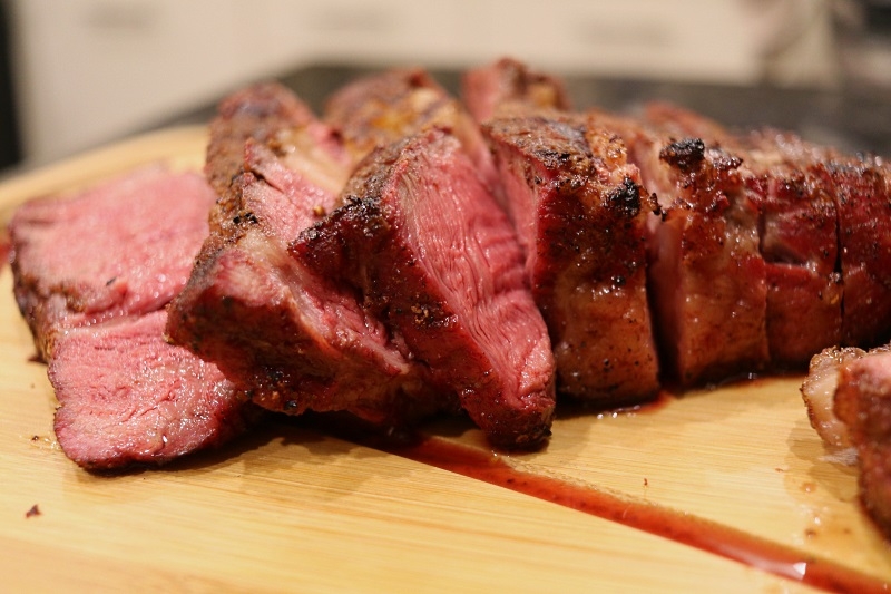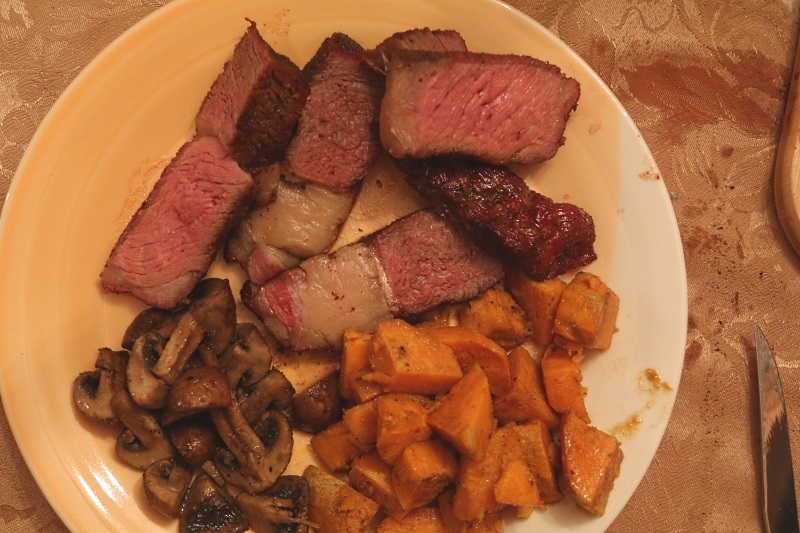 Experience had shown that sweet potatoes take longer than a 2 inch steak, whereas mushrooms take about the same time. So I cooked the sweet potatoes alone with the top open (grid in place ready for the mushrooms) at 135C/275F for 30 minutes. At this point I added the mushroom tray, wrapped the two layer veg contraption in kitchen foil and placed it underneath a raised grid holding the steaks: