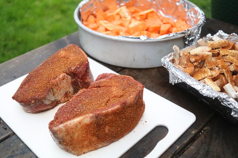 The aim was to cook mushrooms, sweet potatoes and reverse sear a rib-eye steak all on the LBGE.