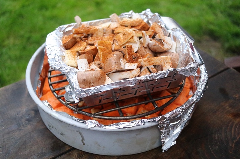 The ingredients were separated with sweet potatoes in a lined 15 inch cake tin and the mushrooms in a lined square Weber veg tray.