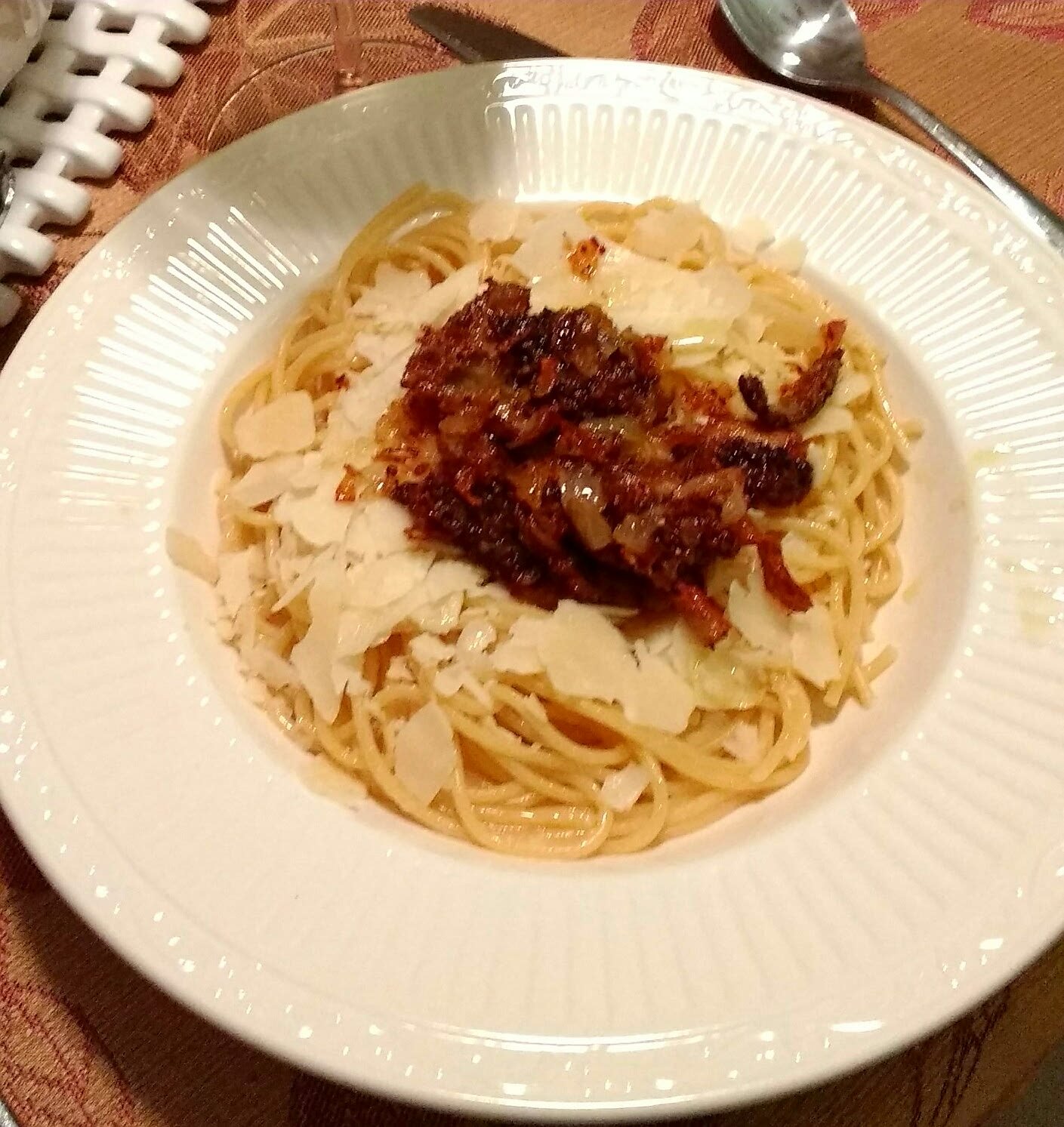 Pasta with sauté Morels, sweet onion, garlic, in a butter cream sauce, topped with shaved parmesean and fresh, coarse ground, black pepper, prepared and served by My Beautiful Wife.