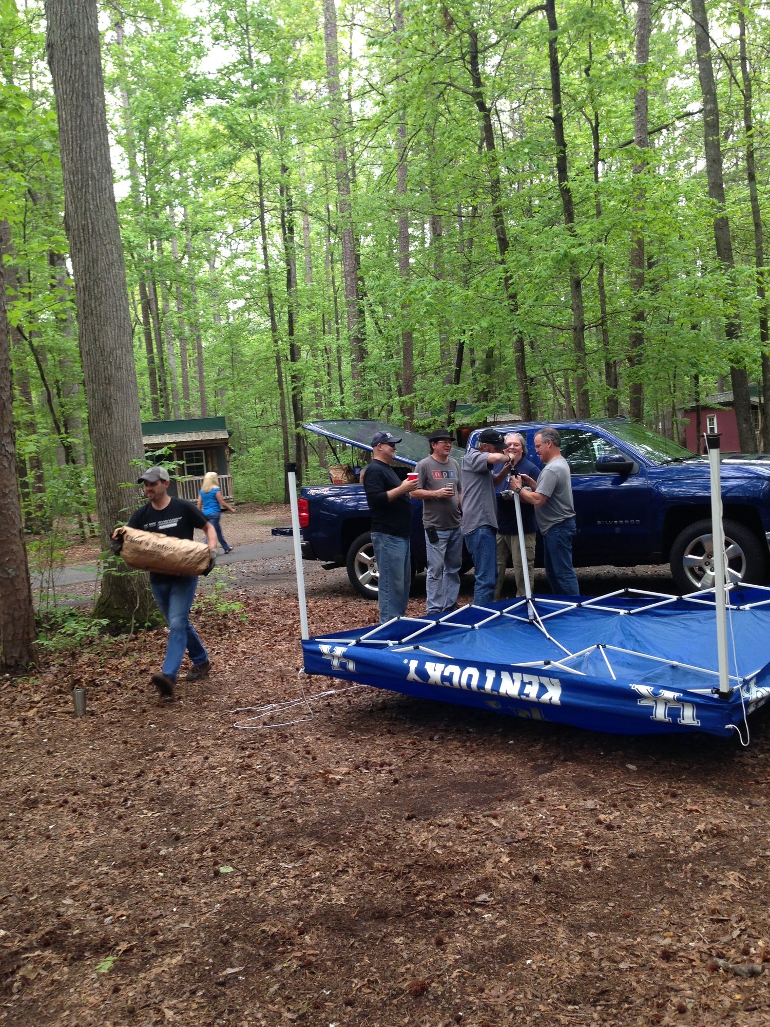 The problem with this process is Nicole is walking in the background while you four five idiots (no offense anyone) try to erect the tent. It would have gone much quicker if the five of you were walking on the road and Nicole was doing the set up.