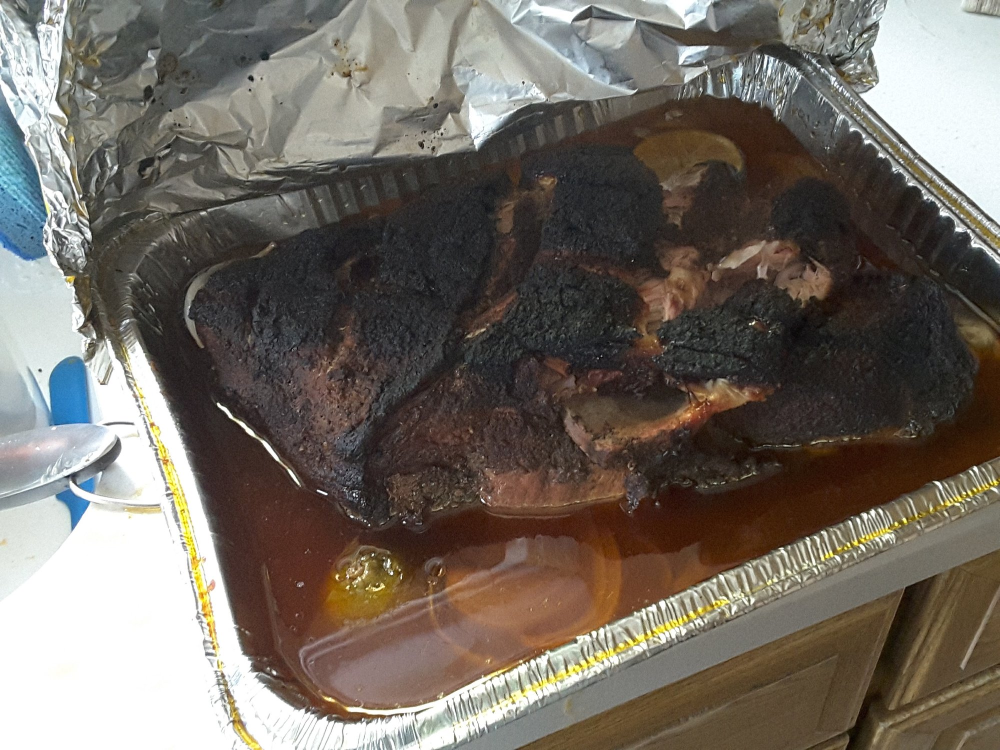 Took the smoked butt and added it to a tray. Added the fat from the smoke along with Tomato juice, orange juice, onions, garlic, limes, oranges and bay leaves. Wrapped the tray in foil and put it back on the egg at 300 degrees for another 3.5 hours.