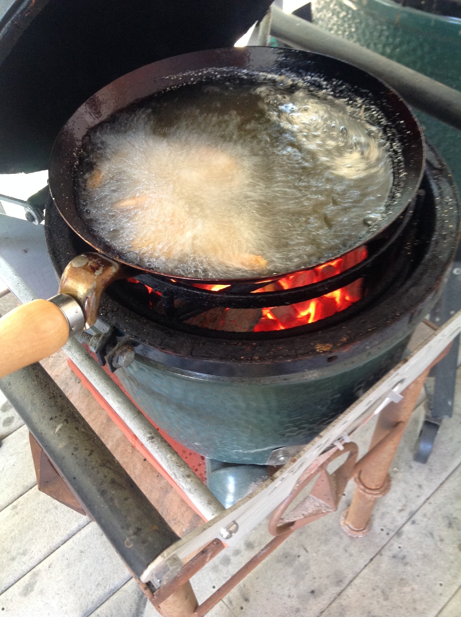I don't deep-fry anymore (leave that to the restaurants) but it occurred to me, I'd rather have an oil fire in my Egg on the patio, than on my gas kitchen stove.  I'm just as clumsy in both environments.