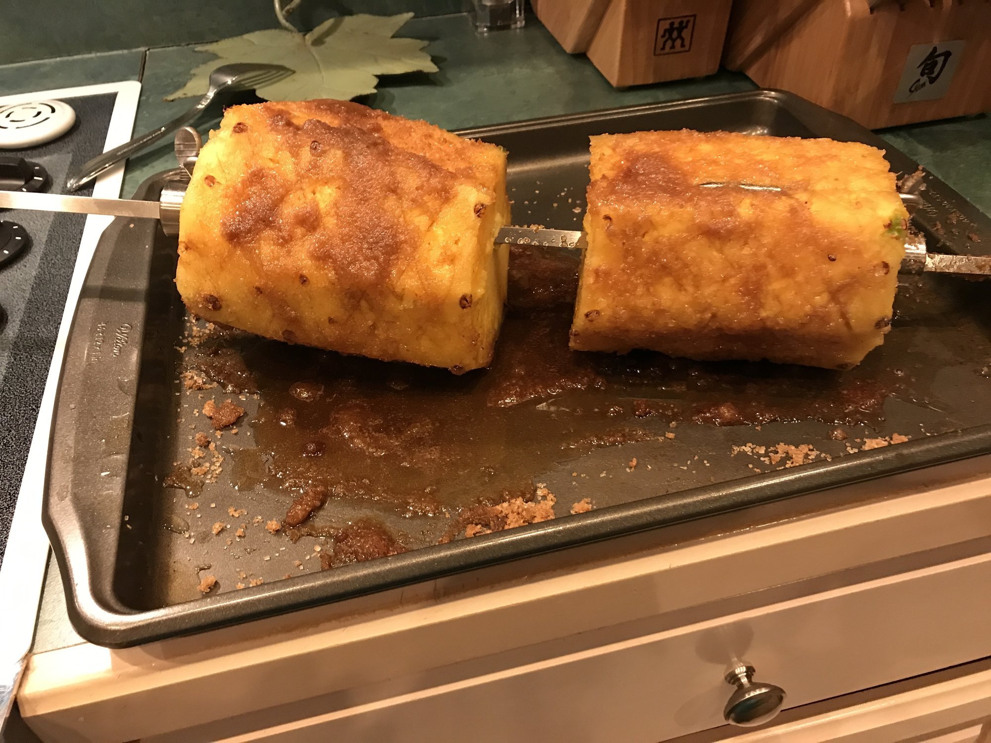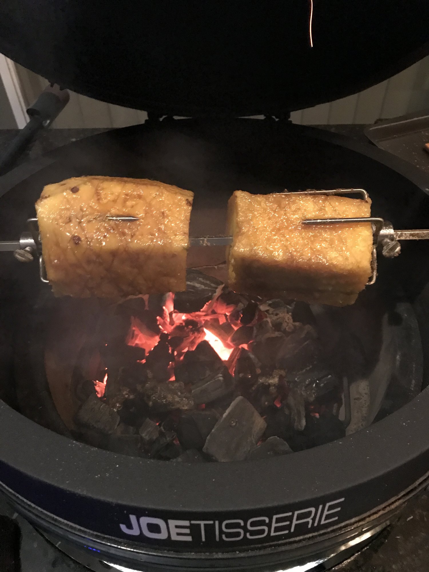 I tried these last night. Didn't look as good as the video, but still delicious. Need to figure out how to keep the sugar on the pineapple as it spins so that a real crust forms. Did these at 400-425 on the Joetisserie for about an hour. Next time will lower temp a bit to reduce burning. @Focker What's under the foil? Sounds like that may solve the burning problem.