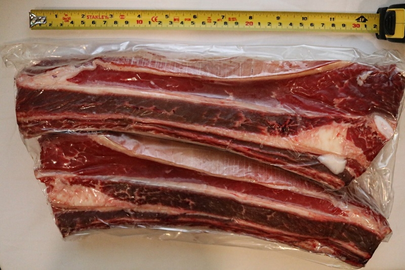 They had some plate ribs that were already cut (they could do chuck ribs but would have needed time to cut them). The plate ribs were much longer than the first ones I tried (the butcher I spoke to today concurred with @jlsm that they I had were a single rib that had been cut in half). The ones I pictured below, total weight is 2.8kg/6.2lb. The butcher reckoned on 8-9 hours at 125C for this size.