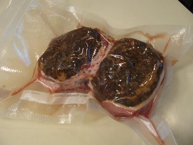 Well after 24 hours I decided it was time to sous vide these meat pucks, but that marinade had to go so I scraped it off and even rinsed them off. Then into a FS bag for 90 minutes at 123º.