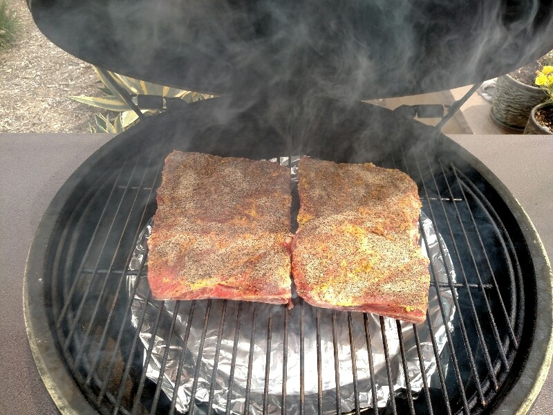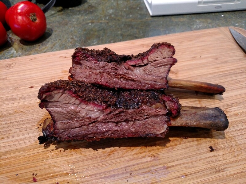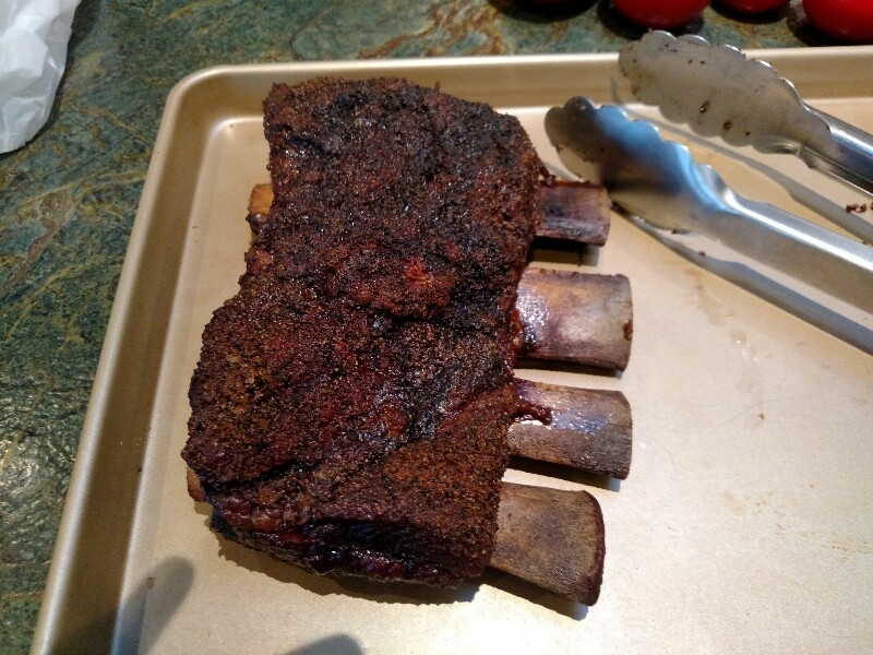 Finally smoked some full beef short ribs yesterday. I forgot to ask the butcher what grade they were. I'm guessing there was about 3 - 4 pounds of meat on the two racks after trimming. Dry brined them overnight and made my own SPOG rub. Smoked (w/oak) at 250F (dome) until they were in the 205 - 210F range, about 7 hrs.