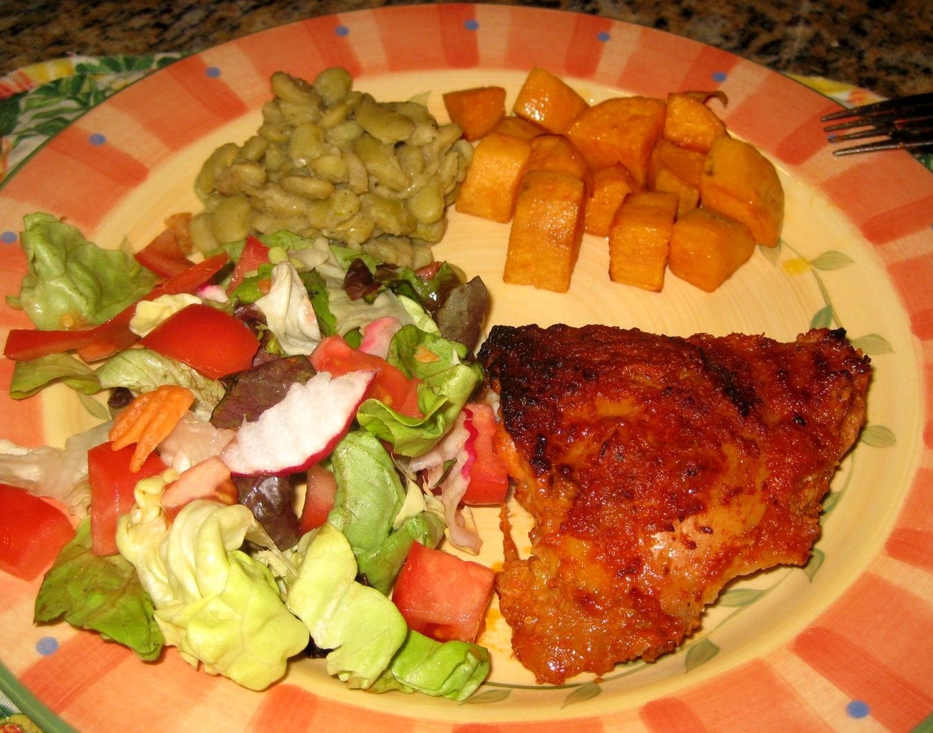 Served with cubed, roasted sweet potatoes drizzled with olive oil, some lima beans and a side salad.