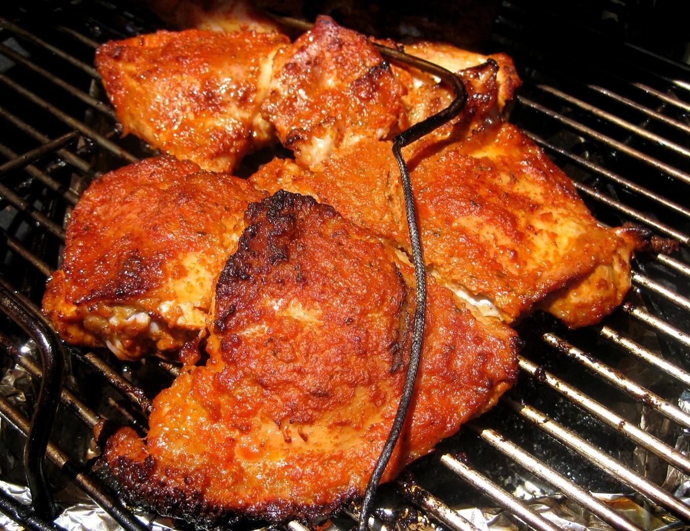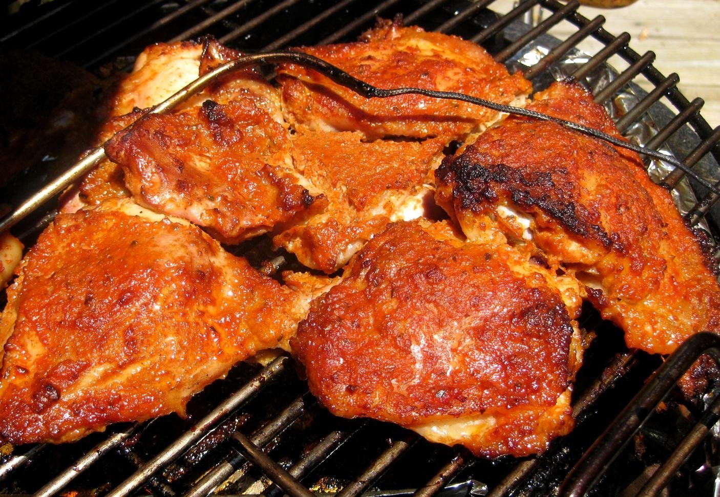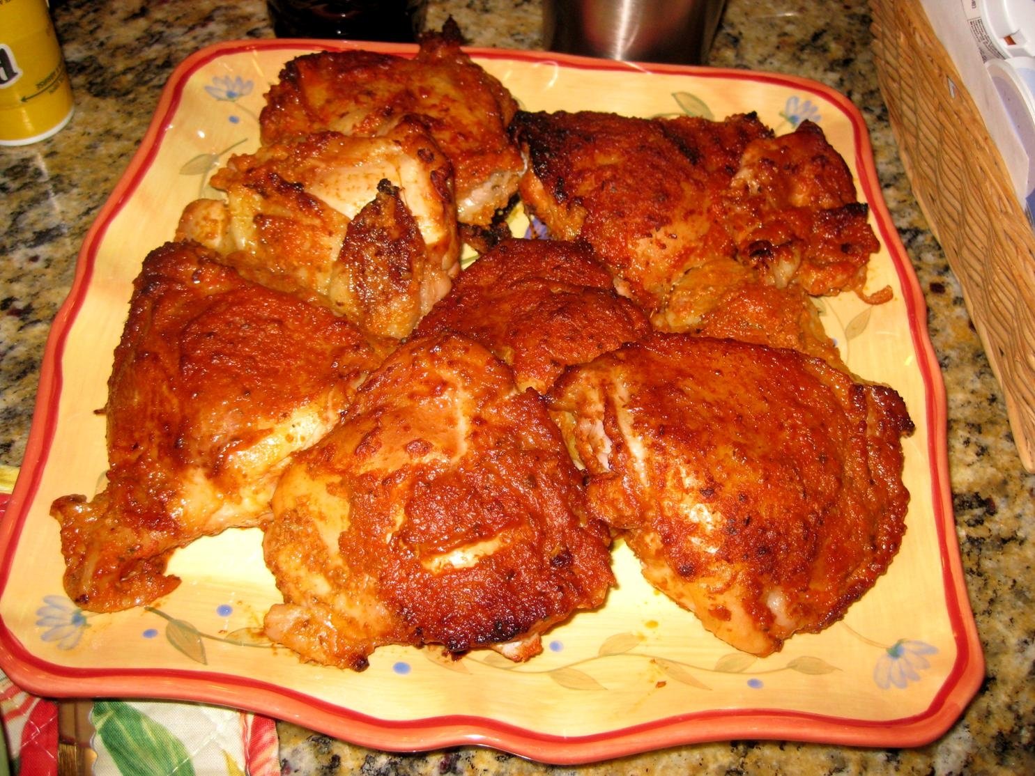 So these were cooked indirect at 350 degrees to an internal temp of 165 with a few apple wood chips for smoke. Turned out very good. I like the color on these. Marinated the thighs in a Green Valley Ranch Peri-Peri Sauce I bought for .99 cents at Ollie's. It is good, but hotter than Nando's.