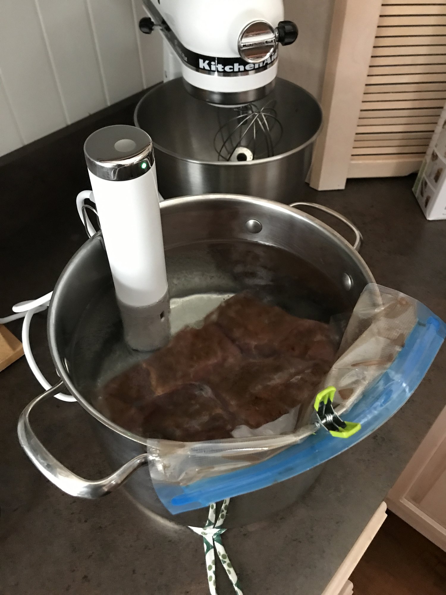 First time for me with my new sous vide circulator. Did water bath for an hour @ 129 then a quick sear on the egg. Probably the best steak I've done.