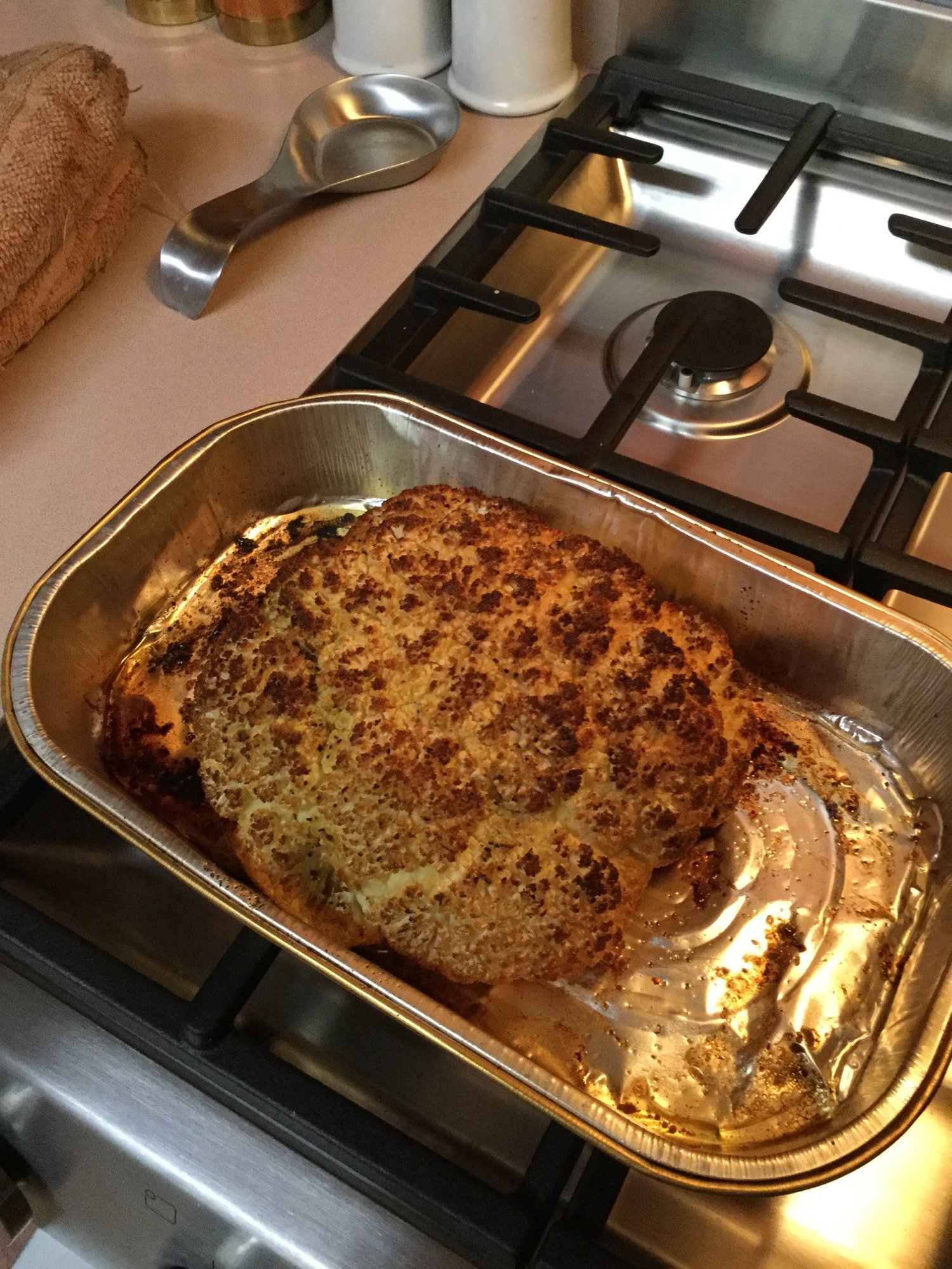 Tried something new last night. I took a whole head of cauliflower, painted it with olive oil, covered it with a spice rub, and roasted it on the egg. It took about 90 minutes at 375. This is a keeper!