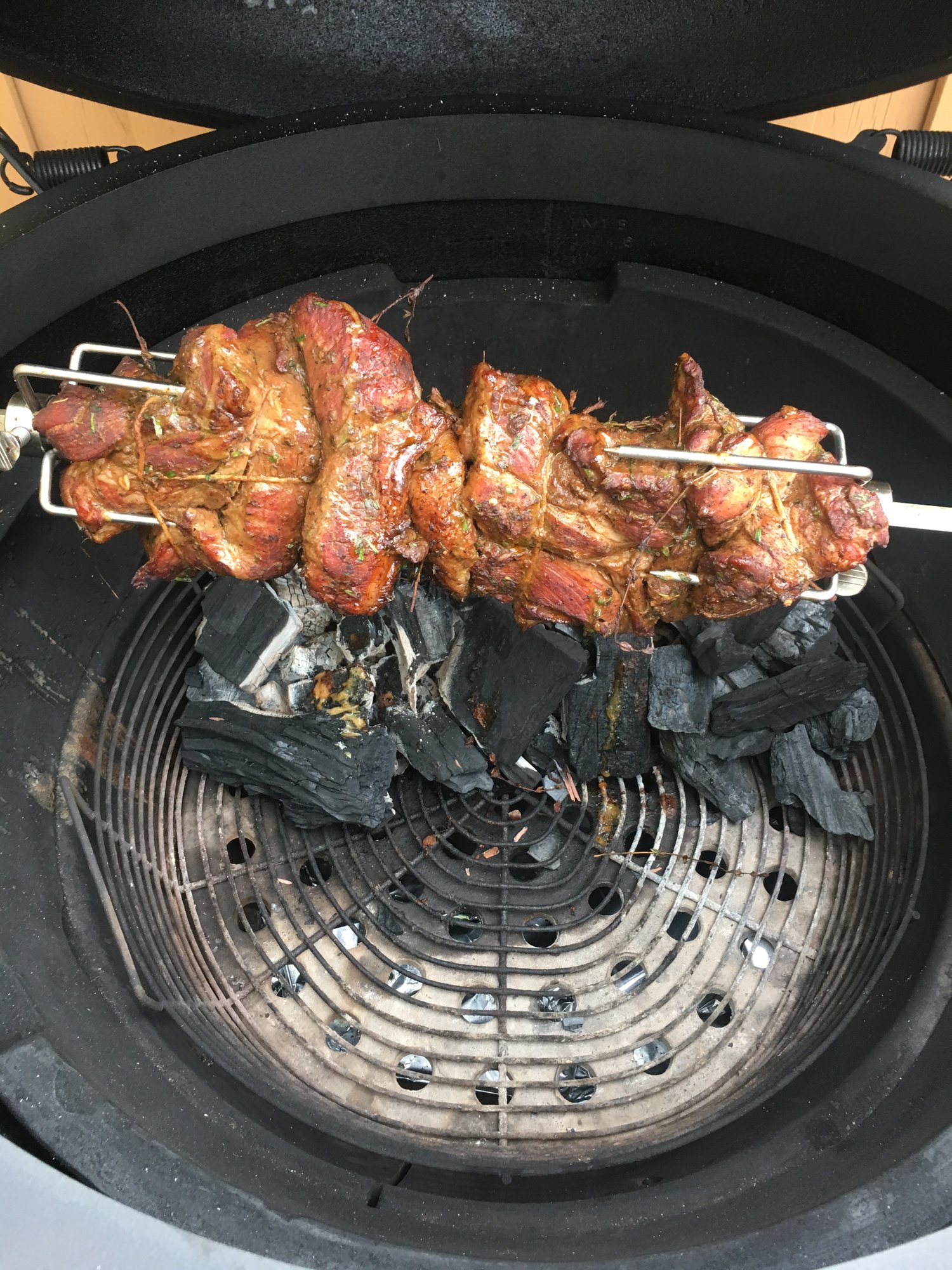 Went for another spin on the XL joetisserie today. Jerk pork smoked with pimento wood. Turned out great.
