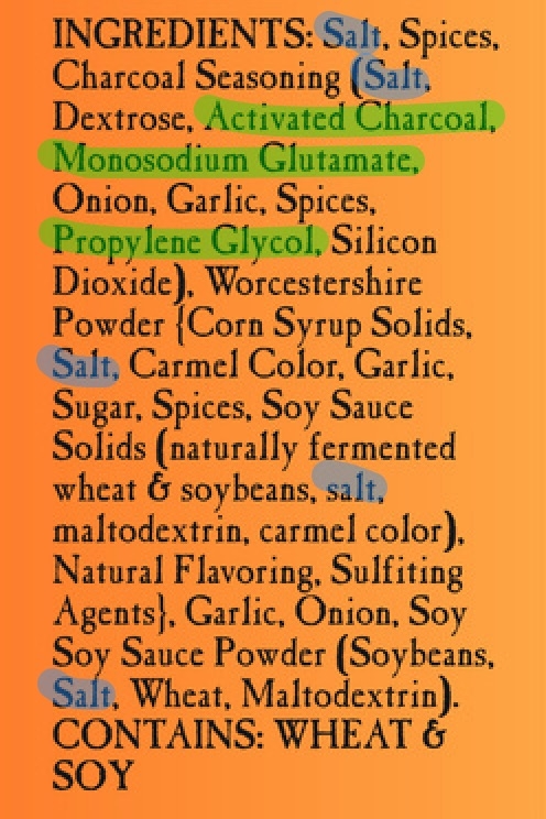 My favorite is the seasoning blend that contains not only activated charcoal, but tons of salt, MSG and umm, aircraft deicer. This is a pic of the label from several years ago. In fairness, the ingredients might have changed.