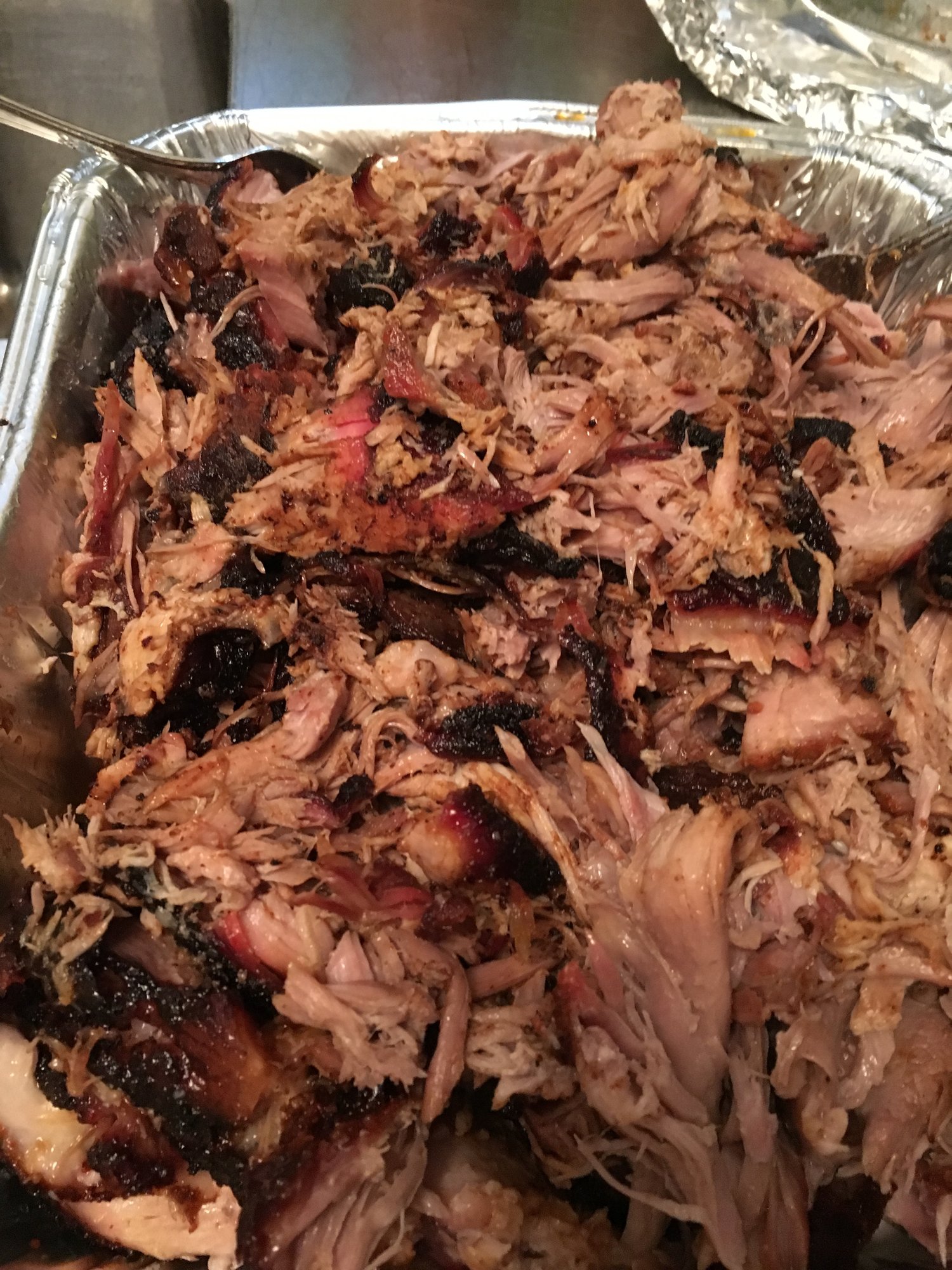 Inspired by @theophan post I made the Giddy Swamp South Carolina Mustard Sauce, plus some of my usual vinegar sauce, and bought a nice big pork shoulder. The mustard sauce, by the way, was excellent and will be making regular appearances around here. Threw the butt on at 250 or so with hickory chunks, and cooked it until it was done...