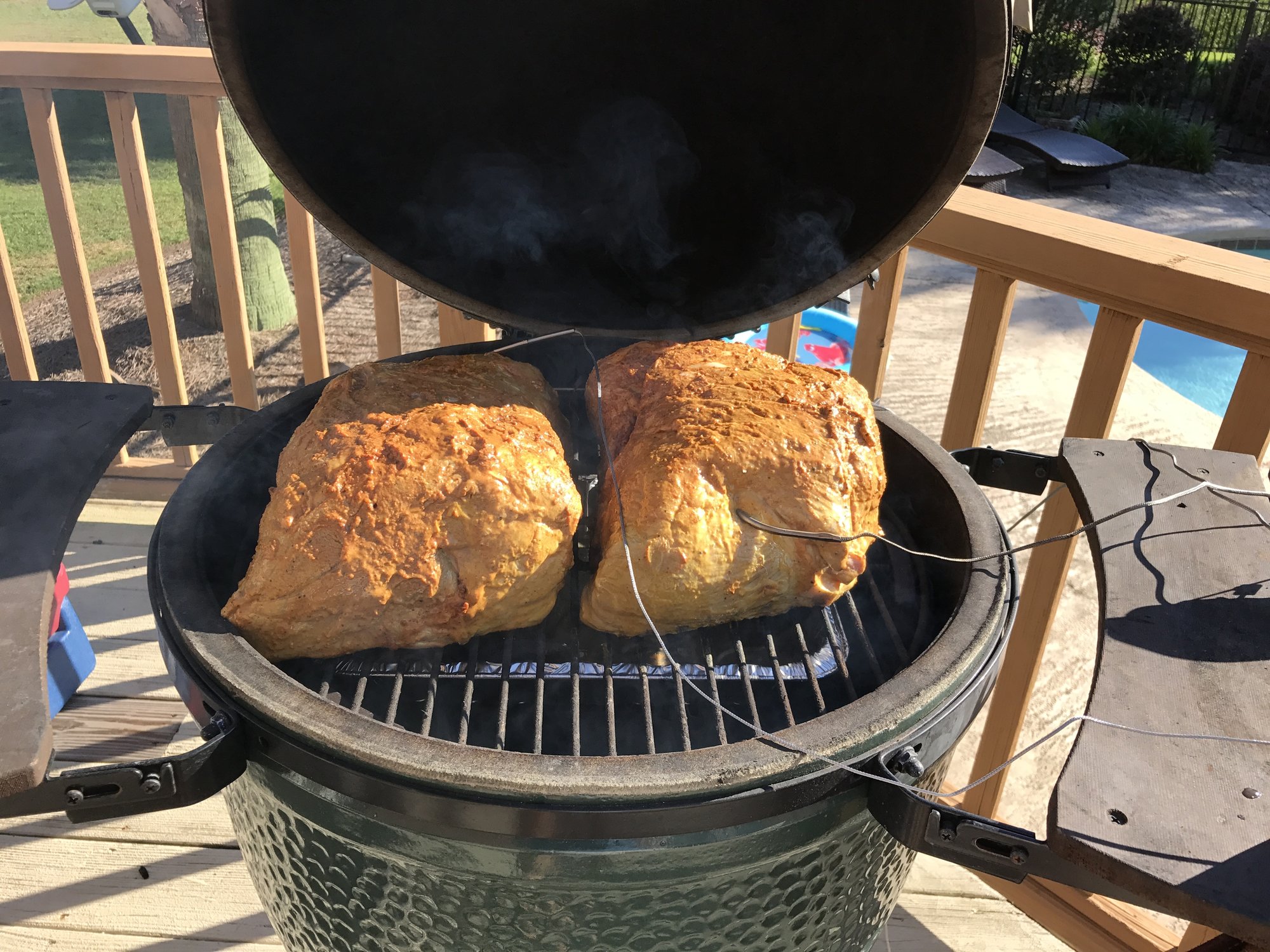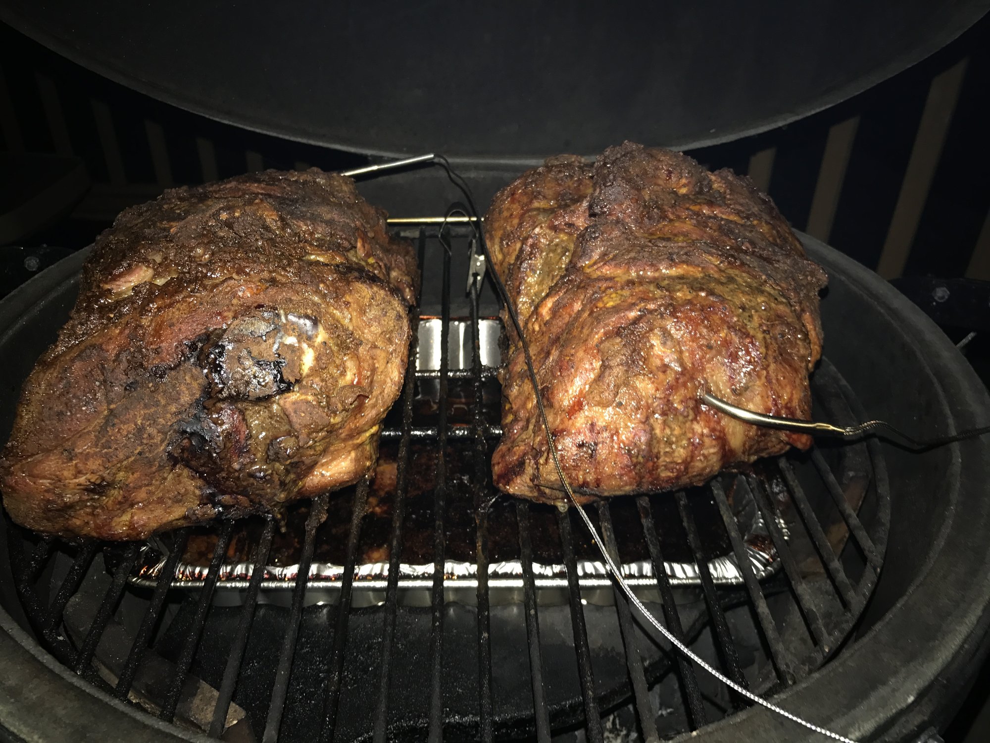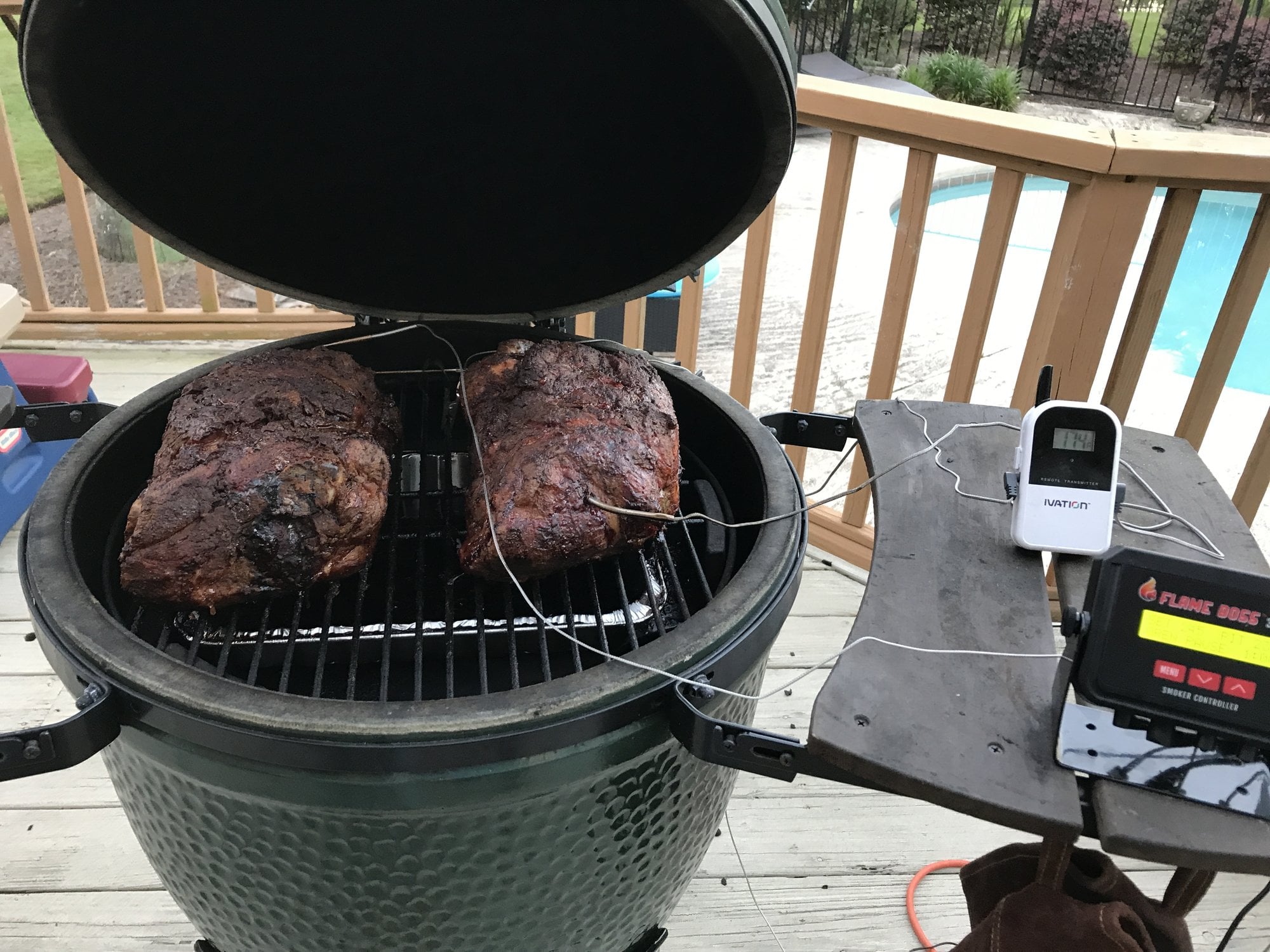 having friends over for memorial weekend and did 2 9lb butts. Was concerned so I pulled the trigger on a flame boss 300. Super easy to set up and all information was available wifi to both my laptop and my cell phone. Put on at 6 last night and pulled at 8:15 this morning. Highly recommend the flame boss if you are in debate. Also thank you to every one on this site for helping me make the right decisions when using my egg. Haven't had a bad meal since I joined the forum.