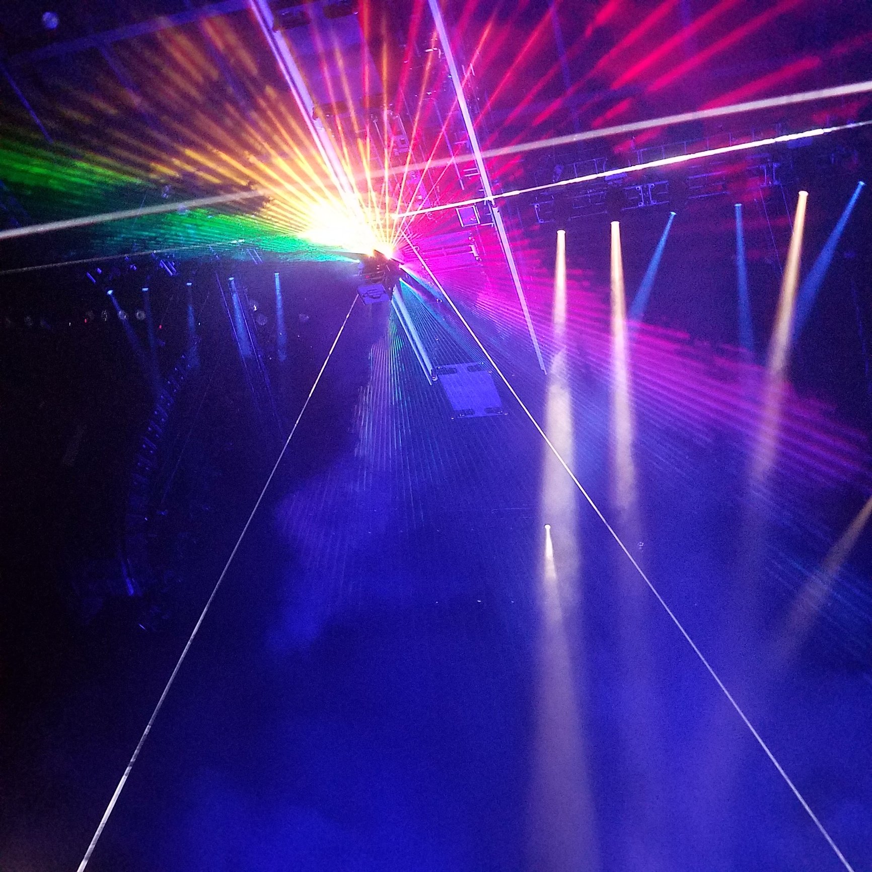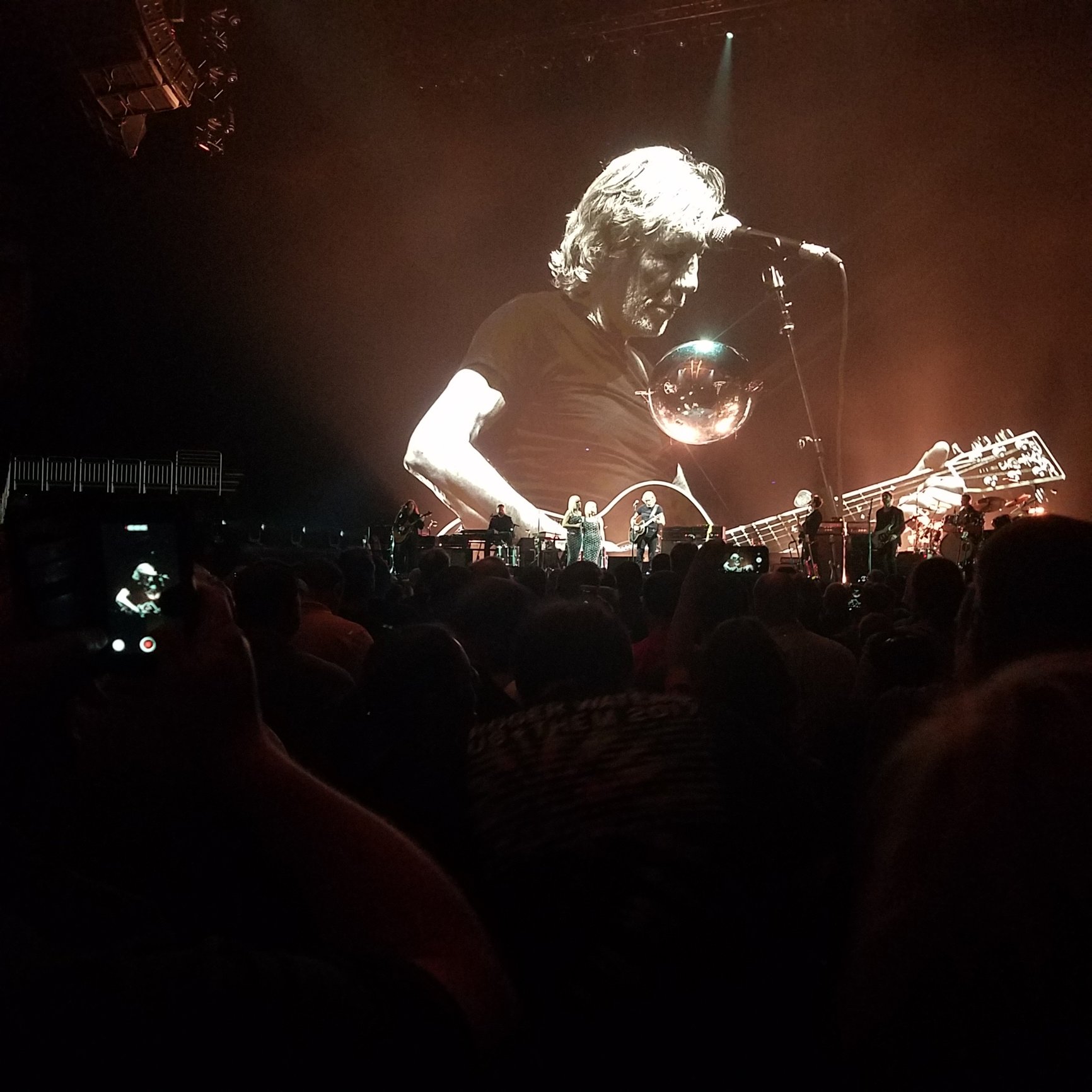 We were dead center inside the Prism, of the "Dark side of the Moon", with our seats. All of the Flying Pigs were right over us, as was the floating silver orb. The broken colors from the prism were shined straight down on us, for the entire set.