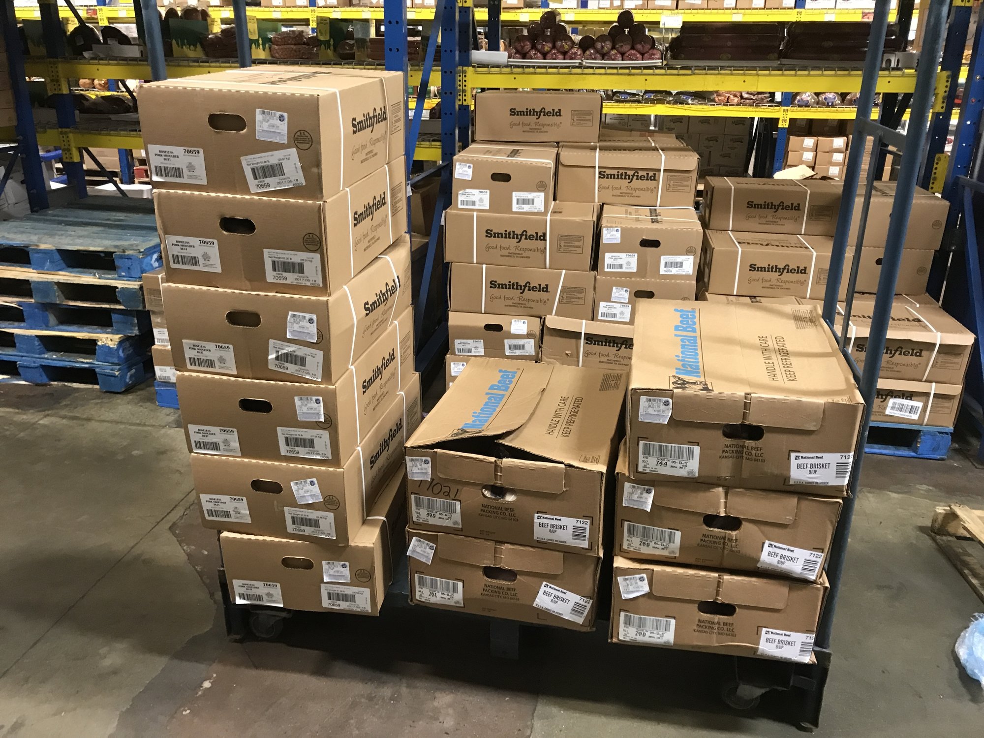 400# of brisket and about the same in pork butts. Unfortunately they only had boneless butts.
