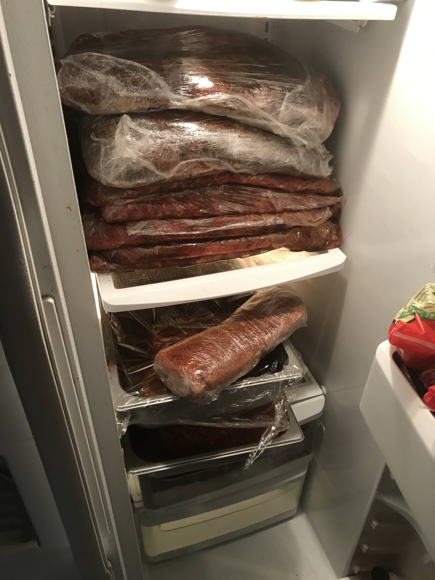 Just finished prepping 14 racks of baby backs, 4 briskets, 8 butts, and a whole pork tenderloin. My 7 y/o grandson open the refrigerator door for me so I could load in the last brisket and he said "whoa."