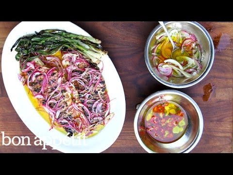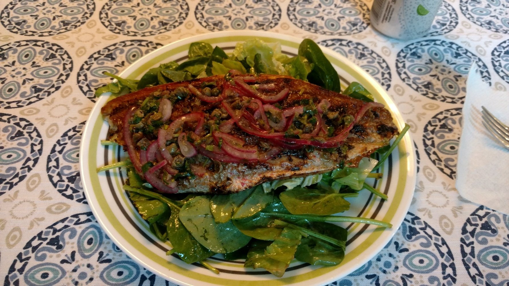 In to plate on top of a spinach and some kind of mild cabbagey type veggie my neighbor grew salad tossed with oil & vinegar.