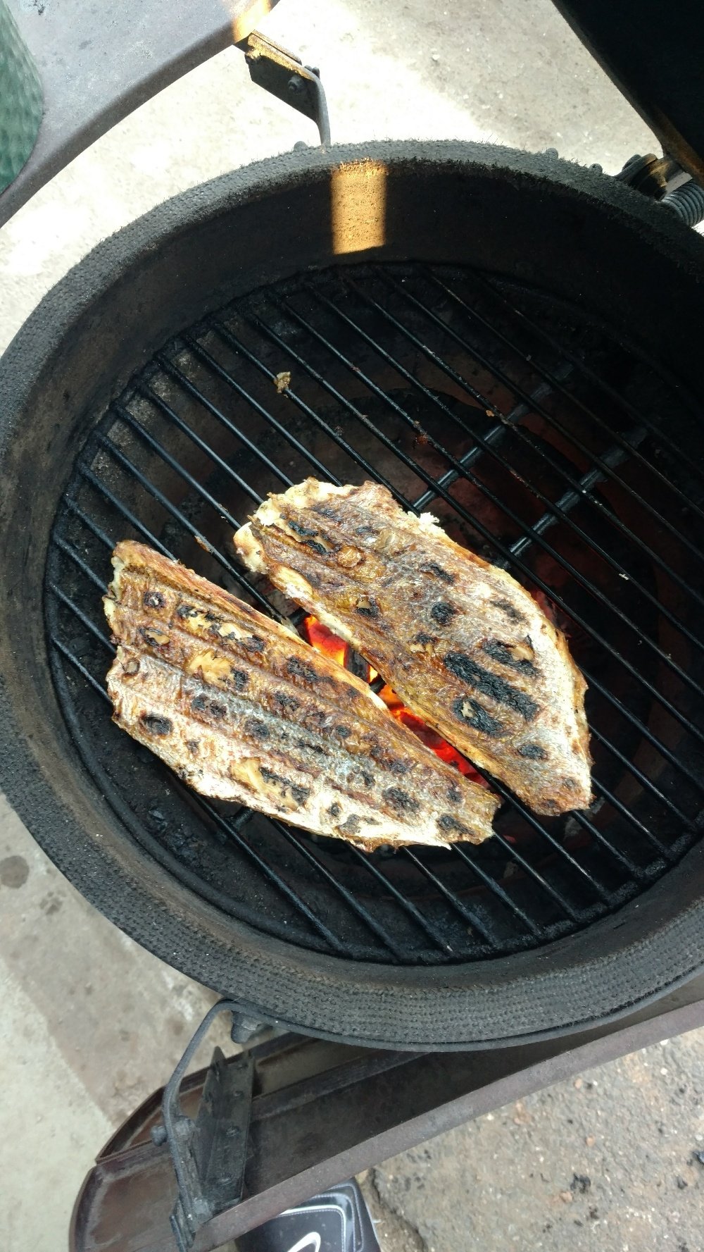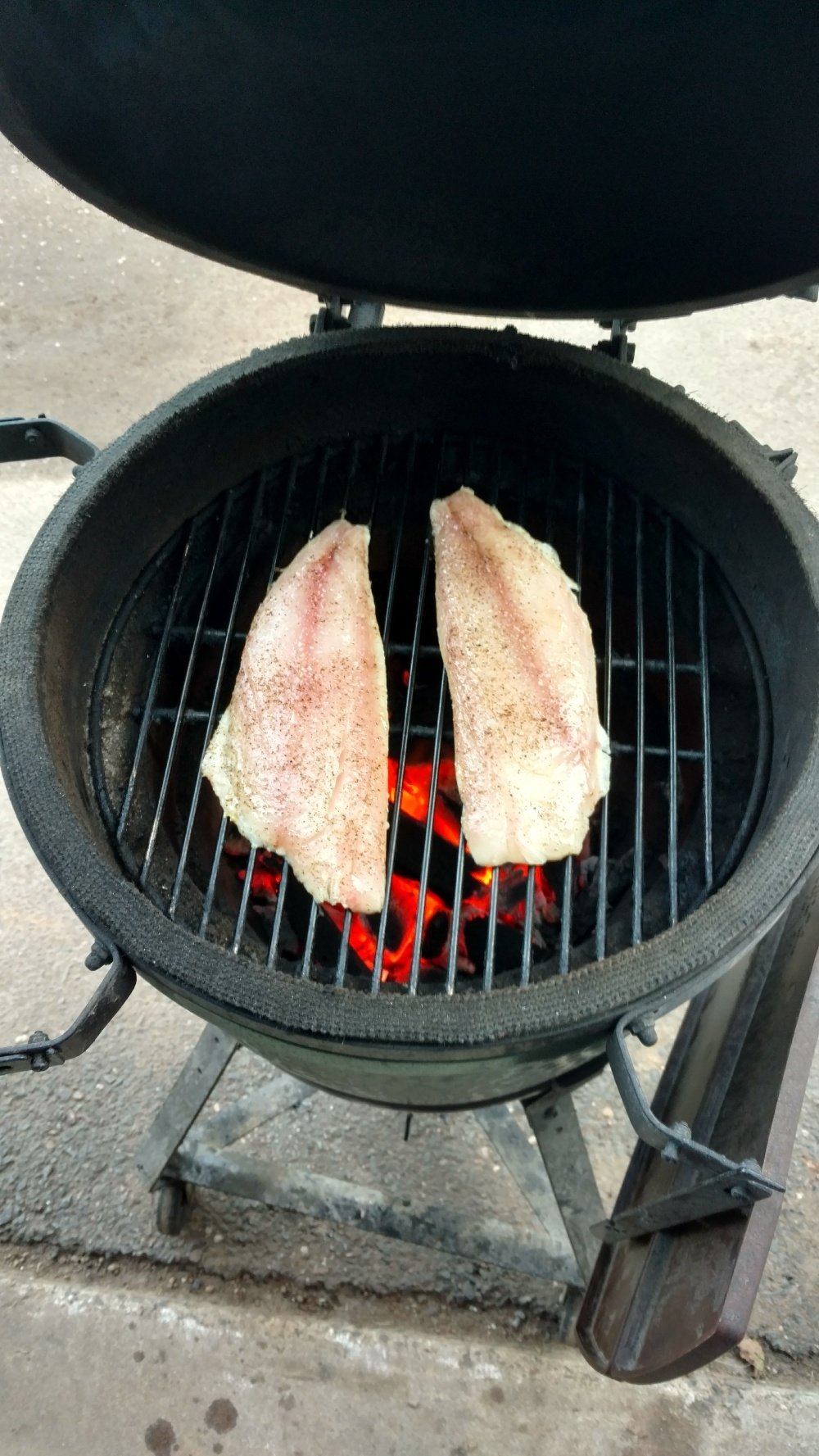 Couple of nice fillets dried and coated with olive oil salt & pepper then on the grill with the lid open and bottom vent almost closed