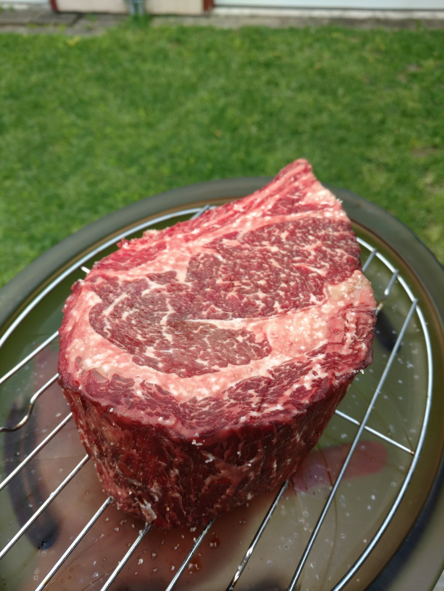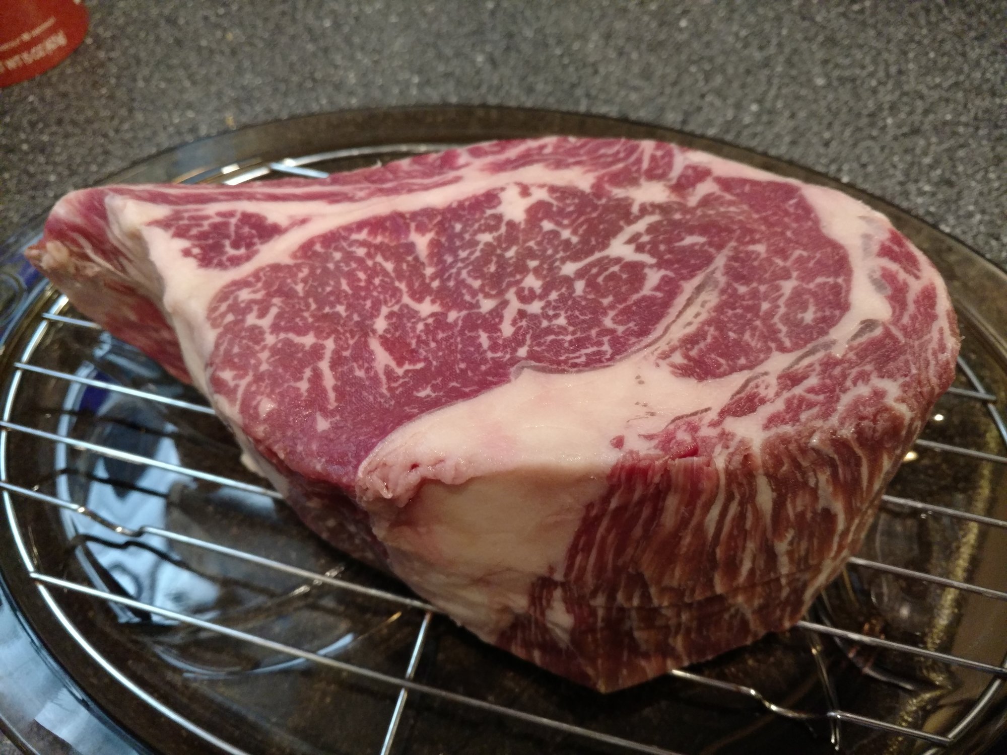 Big bone in ribeye resting in the fridge. Either it cook tonight or tomorrow. Little over 3" thick.
