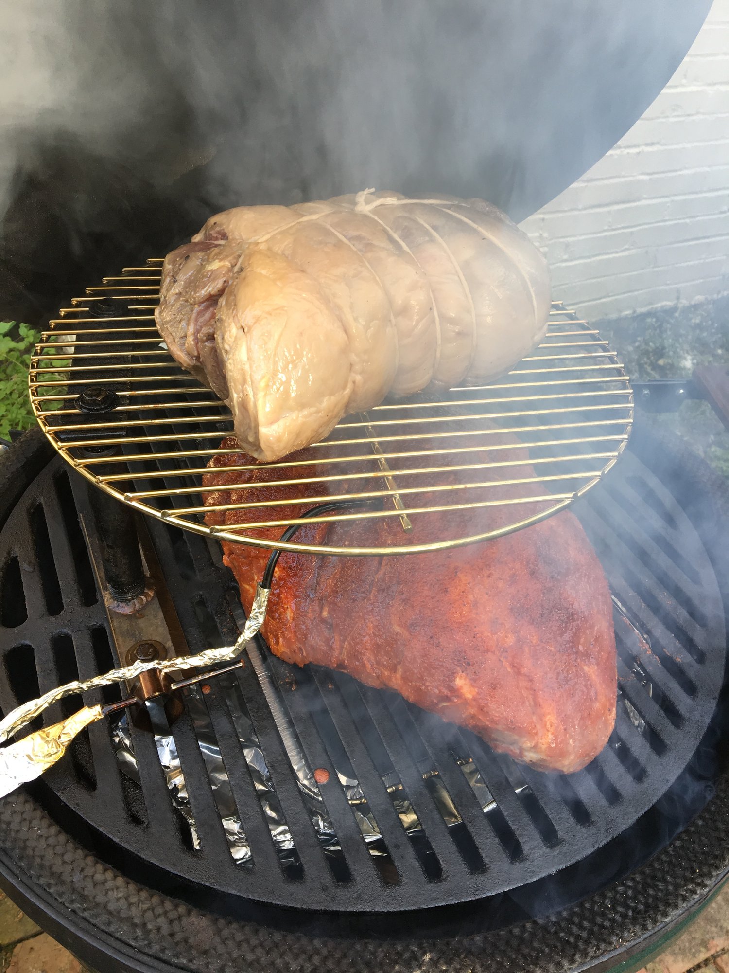 Smoking a ten pound butt for my Mom's 85th Birthday dinner tonight. She specifically requested pulled pork from my BGE. The leg of lamb roast belongs to a buddy of mine who is hitching a ride in the egg