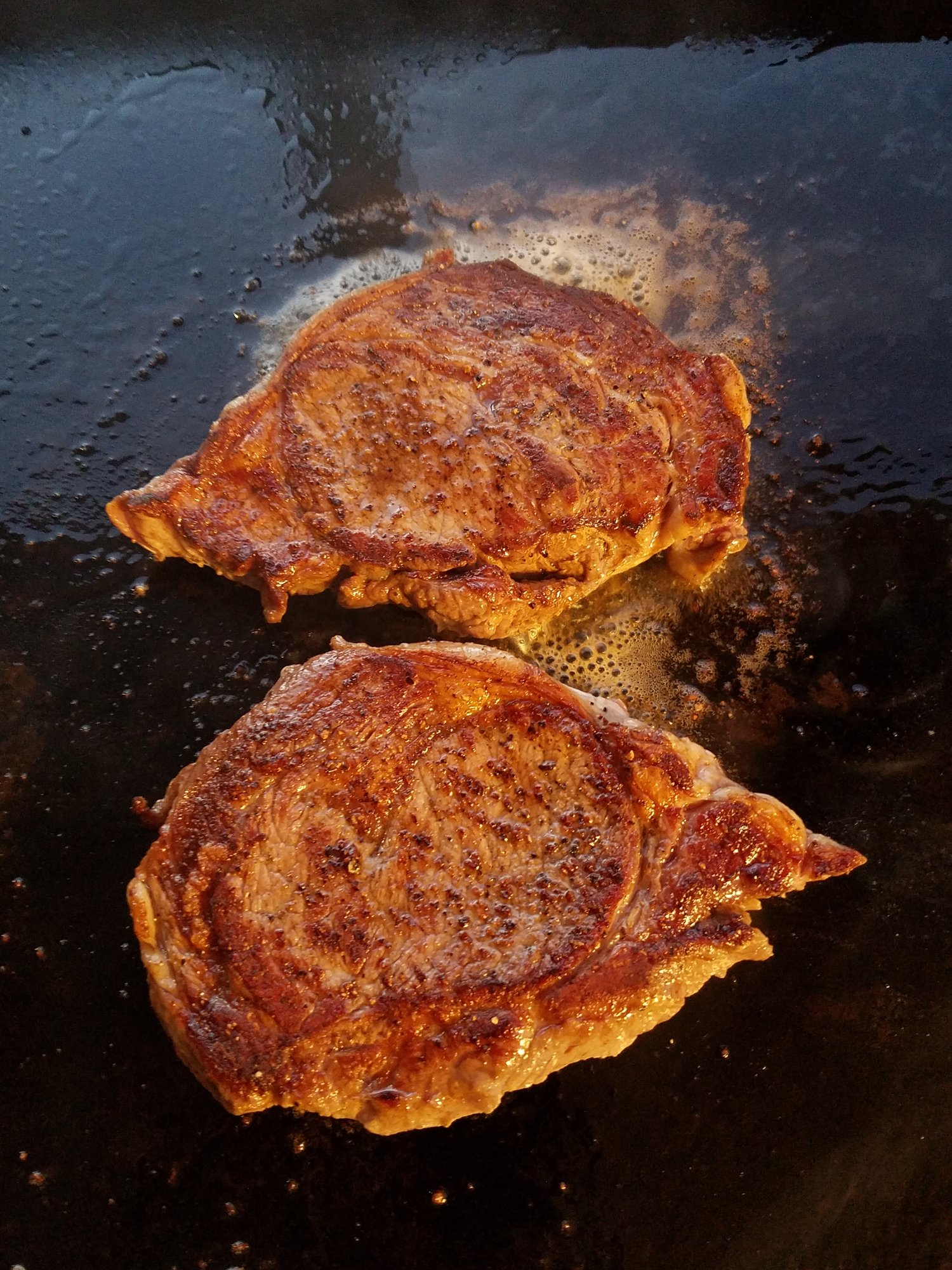 And from the Blackstone - Ribeye, started in the Sous Vide and finished on the BS along with quartered lobster tails. Accompanied by Garlic Roasted Green Beans and Oven roasted red taters.