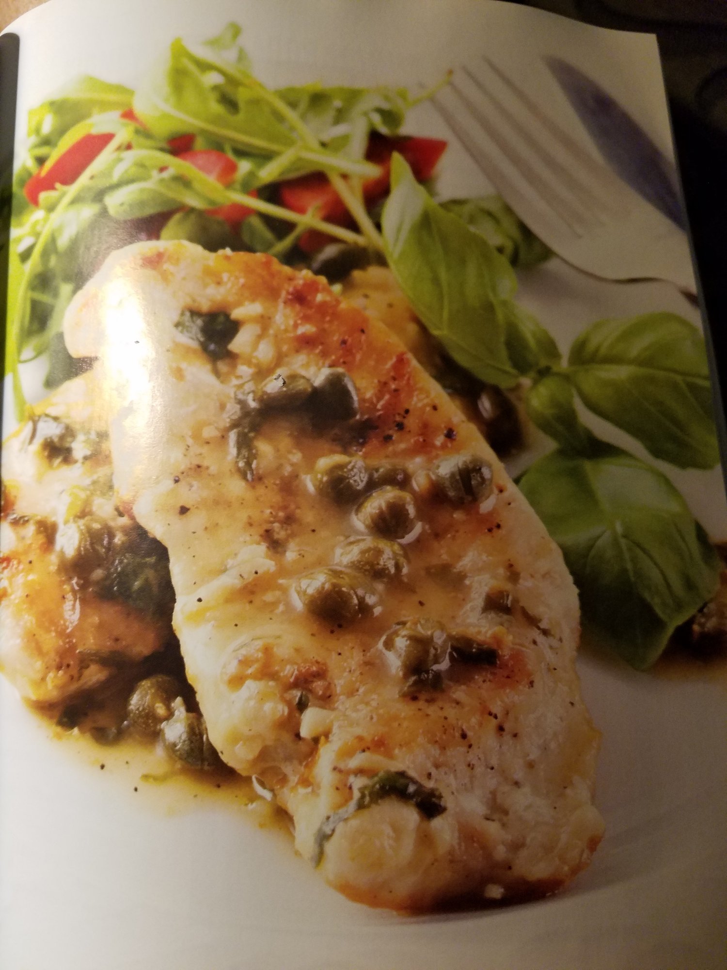 Lemony Chicken Piccata over Angel Hair Pasta. The pic is from the book as I forgot to do a plated pic. Sorry