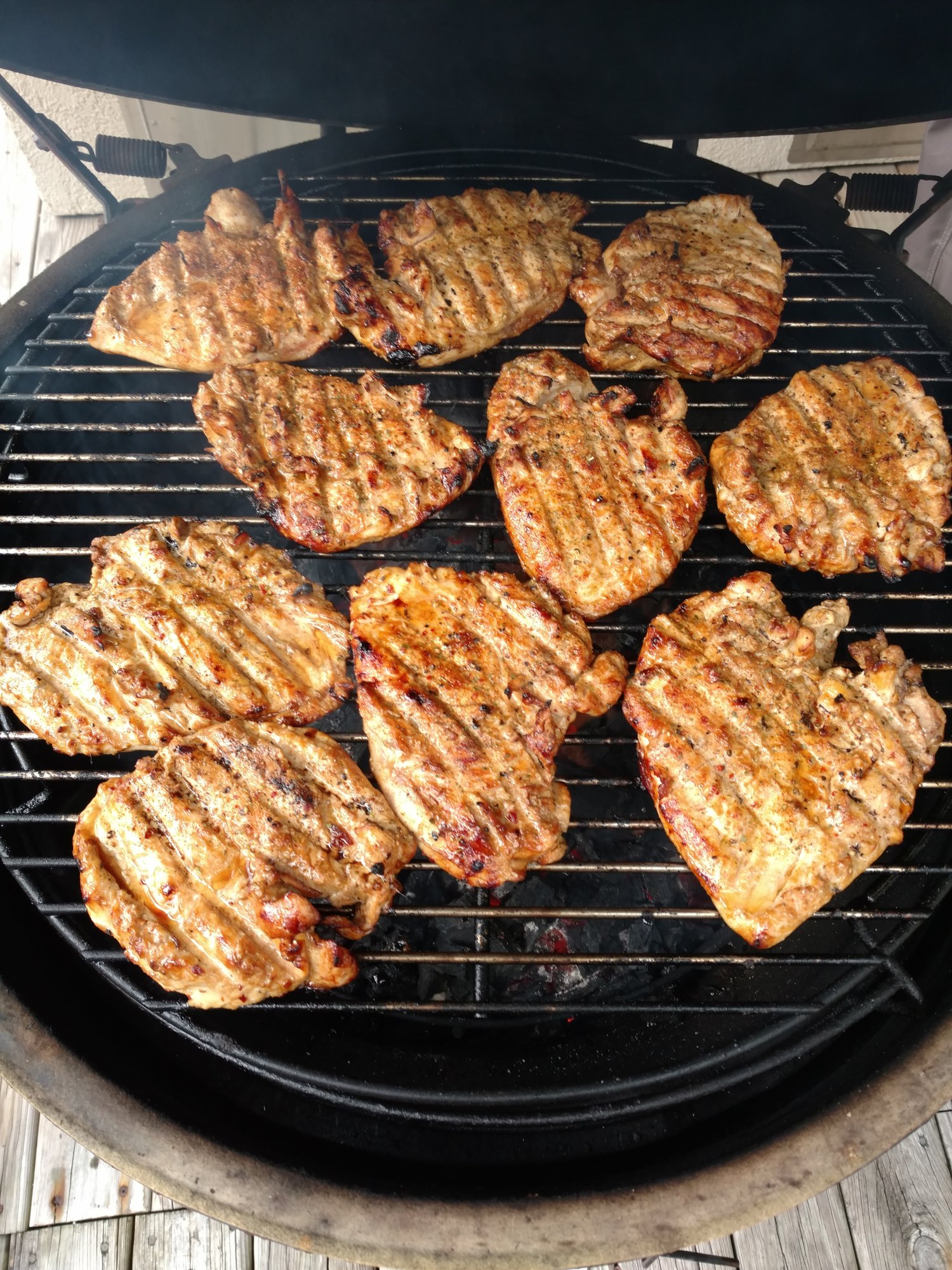 Found a good sale on some nice breasts. 2 batches on the XL. Some ginger teriyaki, good light olive oil, Worcestershire and some local seasoning. Raised, direct about 400*. Came out great.