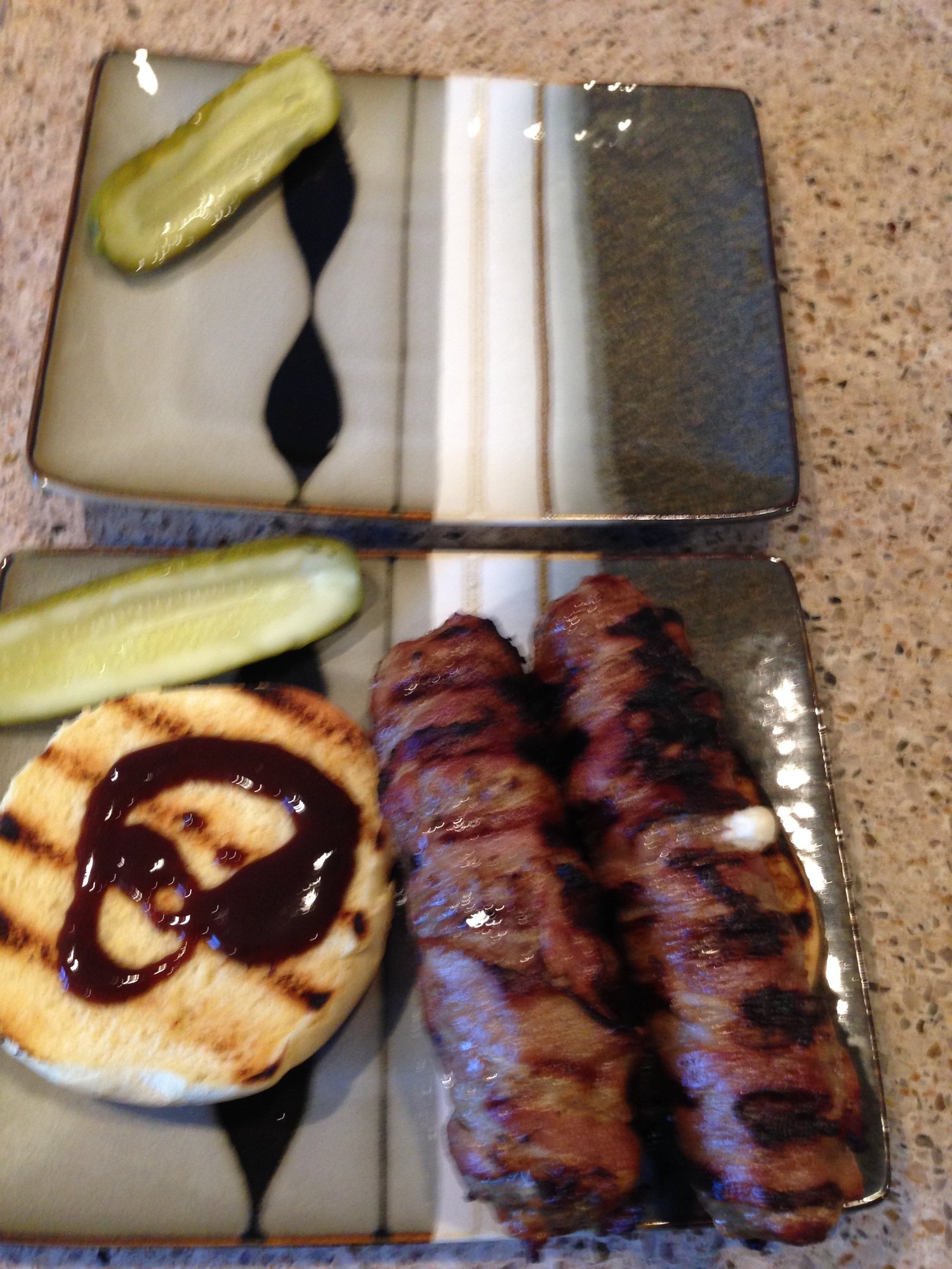 It took a little longer than I expected at this temp, but I just rolled them around until I saw cheese come out the side of one, then checked internal temp - I was looking for 130º - loaded the bun at 115º - wish I could find the hot dog buns I thought I had. Strike two - no cheddar, no hot dog buns. So, we used one hamburger bun and split it.